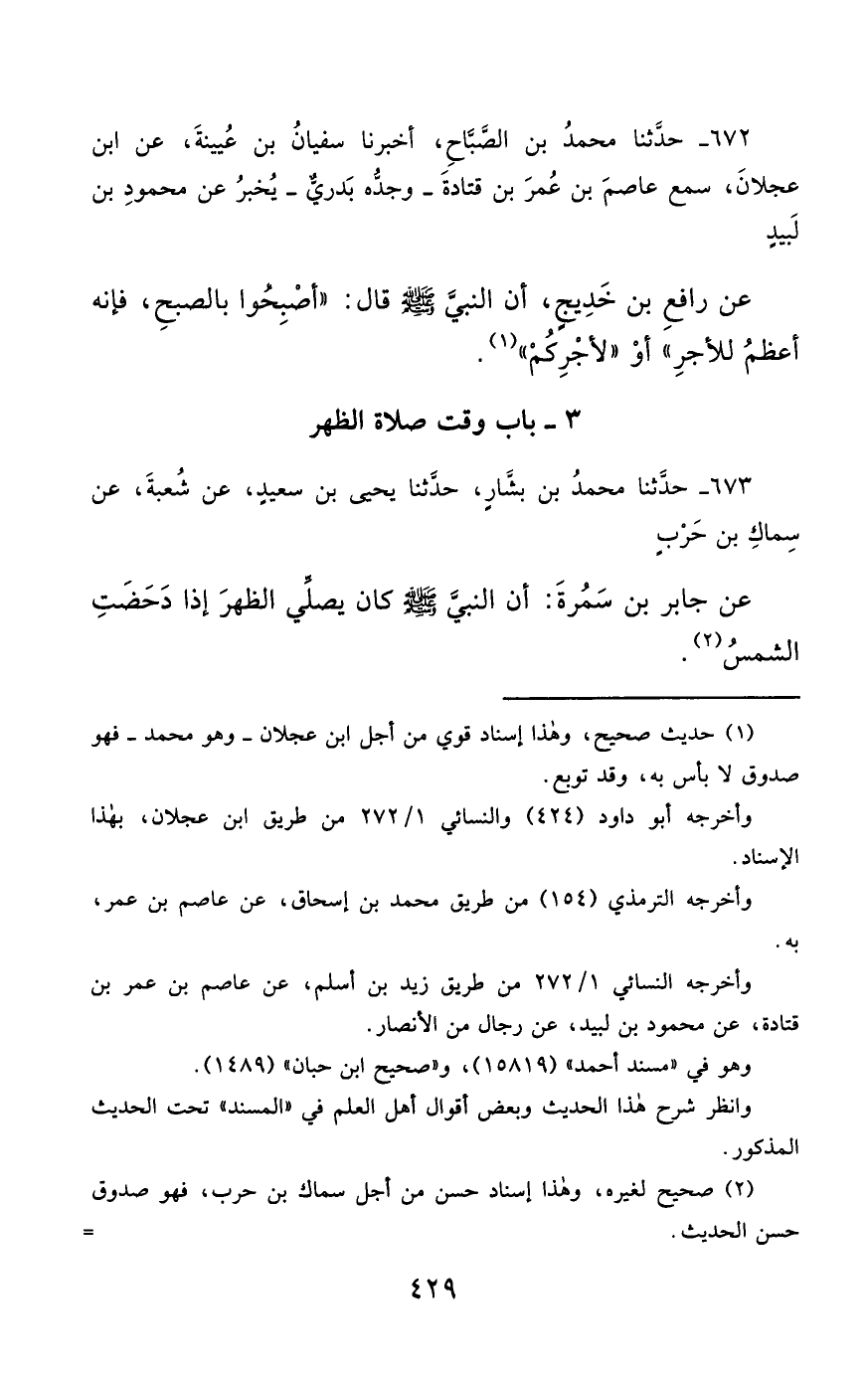 672- حَدَّثَنَا مُحَمَّدُ بْنُ الصَّبَّاحِ ، أَخْبَرَنَا سُفْيَانُ بْنُ عُيَيْنَةَ ، عَنِ ابْنِ عَجْلاَنَ ، سَمِعَ عَاصِمَ بْنَ عُمَرَ بْنِ قَتَادَةَ ، وَجَدُّهُ بَدْرِيٌّ ، يُخْبِرُ عَنْ مَحْمُودِ بْنِ لَبِيدٍ ، عَنْ رَافِعِ بْنِ خَدِيجٍ ، أَنَّ النَّبِيَّ صَلَّى الله عَليْهِ وسَلَّمَ قَالَ : أَصْبِحُوا بِالصُّبْحِ ، فَإِنَّهُ أَعْظَمُ لِلأَجْرِ ، أَوْ لأَجْرِكُمْ.