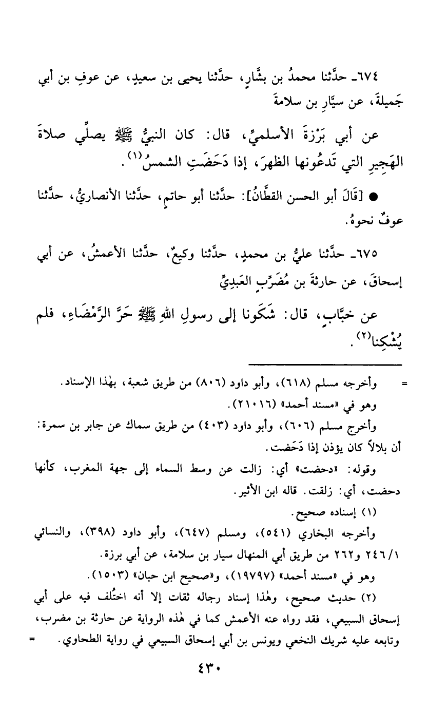 674- حَدَّثَنَا مُحَمَّدُ بْنُ بَشَّارٍ ، حَدَّثَنَا يَحْيَى بْنُ سَعِيدٍ ، عَنْ عَوْفِ بْنِ أَبِي جَمِيلَةَ ، عَنْ سَيَّارِ بْنِ سَلاَمَةَ ، عَنْ أَبِي بَرْزَةَ الأَسْلَمِيِّ ، قَالَ : كَانَ النَّبِيُّ صَلَّى الله عَليْهِ وسَلَّمَ يُصَلِّي صَلاَةَ الْهَجِيرِ الَّتِي تَدْعُونَهَا الظُّهْرَ ، إِذَا دَحَضَتِ الشَّمْسُ.