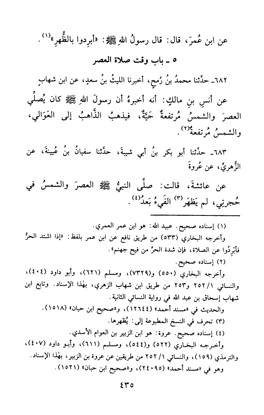 682- حَدَّثَنَا مُحَمَّدُ بْنُ رُمْحٍ ، أَخْبَرَنَا اللَّيْثُ بْنُ سَعْدٍ ، عَنِ ابْنِ شِهَابٍ ، عَنْ أَنَسِ بْنِ مَالِكٍ , أَنَّهُ أَخْبَرَهُ , أَنَّ رَسُولَ اللهِ صَلَّى الله عَليْهِ وسَلَّمَ كَانَ يُصَلِّي الْعَصْرَ وَالشَّمْسُ مُرْتَفِعَةٌ حَيَّةٌ ، فَيَذْهَبُ الذَّاهِبُ إِلَى الْعَوَالِي ، وَالشَّمْسُ مُرْتَفِعَةٌ.