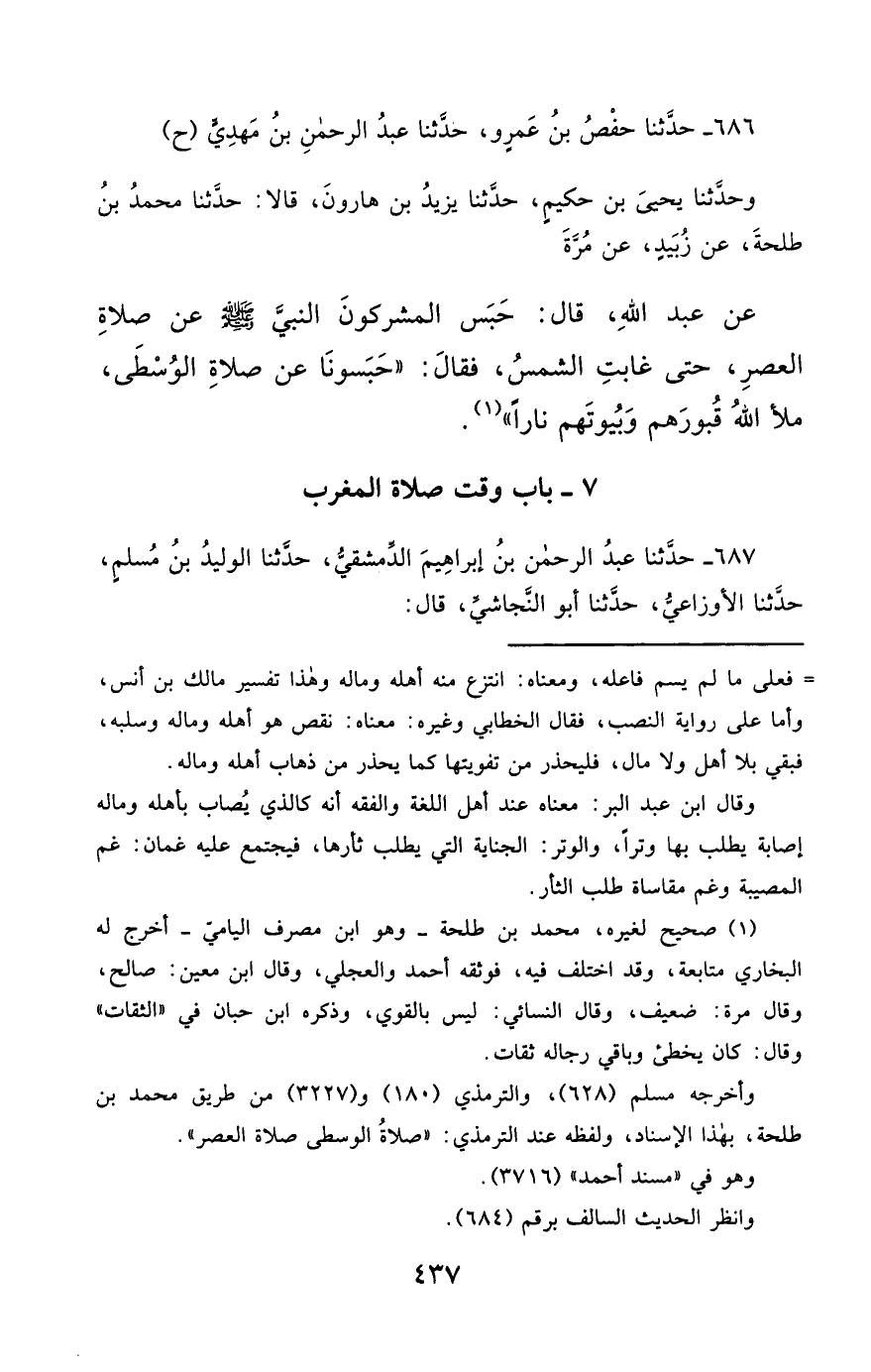 686- حَدَّثَنَا حَفْصُ بْنُ عَمْرٍو ، حَدَّثَنَا عَبْدُ الرَّحْمَنِ بْنُ مَهْدِيٍّ (ح) وَحَدَّثَنَا يَحْيَى بْنُ حَكِيمٍ ، حَدَّثَنَا يَزِيدُ بْنُ هَارُونَ ، قَالاَ : حَدَّثَنَا مُحَمَّدُ بْنُ طَلْحَةَ ، عَنْ زُبَيْدٍ ، عَنْ مُرَّةَ ، عَنْ عَبْدِ اللهِ ، قَالَ : حَبَسَ الْمُشْرِكُونَ النَّبِيَّ صَلَّى الله عَليْهِ وسَلَّمَ عَنْ صَلاَةِ الْعَصْرِ حَتَّى غَابَتِ الشَّمْسُ ، فَقَالَ : حَبَسُونَا عَنْ صَلاَةِ الْوُسْطَى ، مَلأَ اللَّهُ قُبُورَهُمْ وَبُيُوتَهُمْ نَارًا.