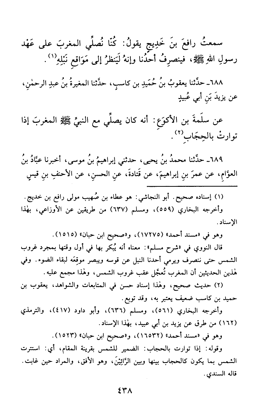 688- حَدَّثَنَا يَعْقُوبُ بْنُ حُمَيْدِ بْنِ كَاسِبٍ ، حَدَّثَنَا الْمُغِيرَةُ بْنُ عَبْدِ الرَّحْمَنِ ، عَنْ يَزِيدَ بْنِ أَبِي عُبَيْدٍ ، عَنْ سَلَمَةَ بْنِ الأَكْوَعِ ، أَنَّهُ كَانَ يُصَلِّي مَعَ النَّبِيِّ صَلَّى الله عَليْهِ وسَلَّمَ الْمَغْرِبَ إِذَا تَوَارَتْ بِالْحِجَابِ.