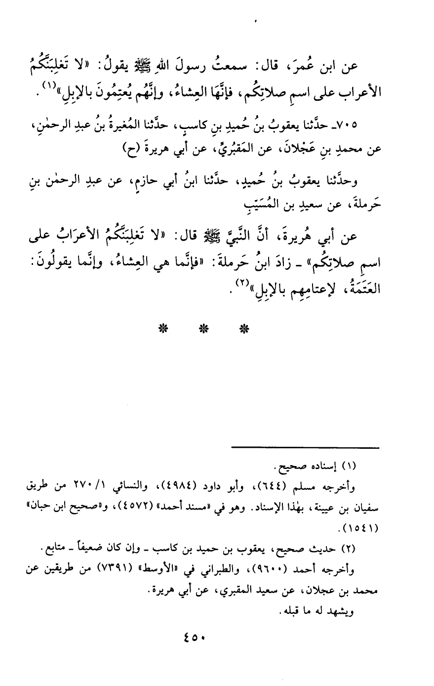 705- حَدَّثَنَا يَعْقُوبُ بْنُ حُمَيْدِ بْنِ كَاسِبٍ ، حَدَّثَنَا الْمُغِيرَةُ بْنُ عَبْدِ الرَّحْمَنِ ، عَنْ مُحَمَّدِ بْنِ عَجْلاَنَ ، عَنِ الْمَقْبُرِيِّ ، عَنْ أَبِي هُرَيْرَةَ (ح) وَحَدَّثَنَا يَعْقُوبُ بْنُ حُمَيْدٍ ، حَدَّثَنَا ابْنُ أَبِي حَازِمٍ ، عَنْ عَبْدِ الرَّحْمَنِ بْنِ حَرْمَلَةَ ، عَنْ سَعِيدِ بْنِ الْمُسَيَّبِ ، عَنْ أَبِي هُرَيْرَةَ , أَنَّ النَّبِيَّ صَلَّى الله عَليْهِ وسَلَّمَ قَالَ : لاَ تَغْلِبَنَّكُمُ الأَعْرَابُ عَلَى اسْمِ صَلاَتِكُمْ , زَادَ ابْنُ حَرْمَلَةَ , فَإِنَّمَا هِيَ الْعِشَاءُ ، وَإِنَّمَا يَقُولُونَ : الْعَتَمَةُ ، لإِعْتَامِهِمْ بِالإِبِلِ.