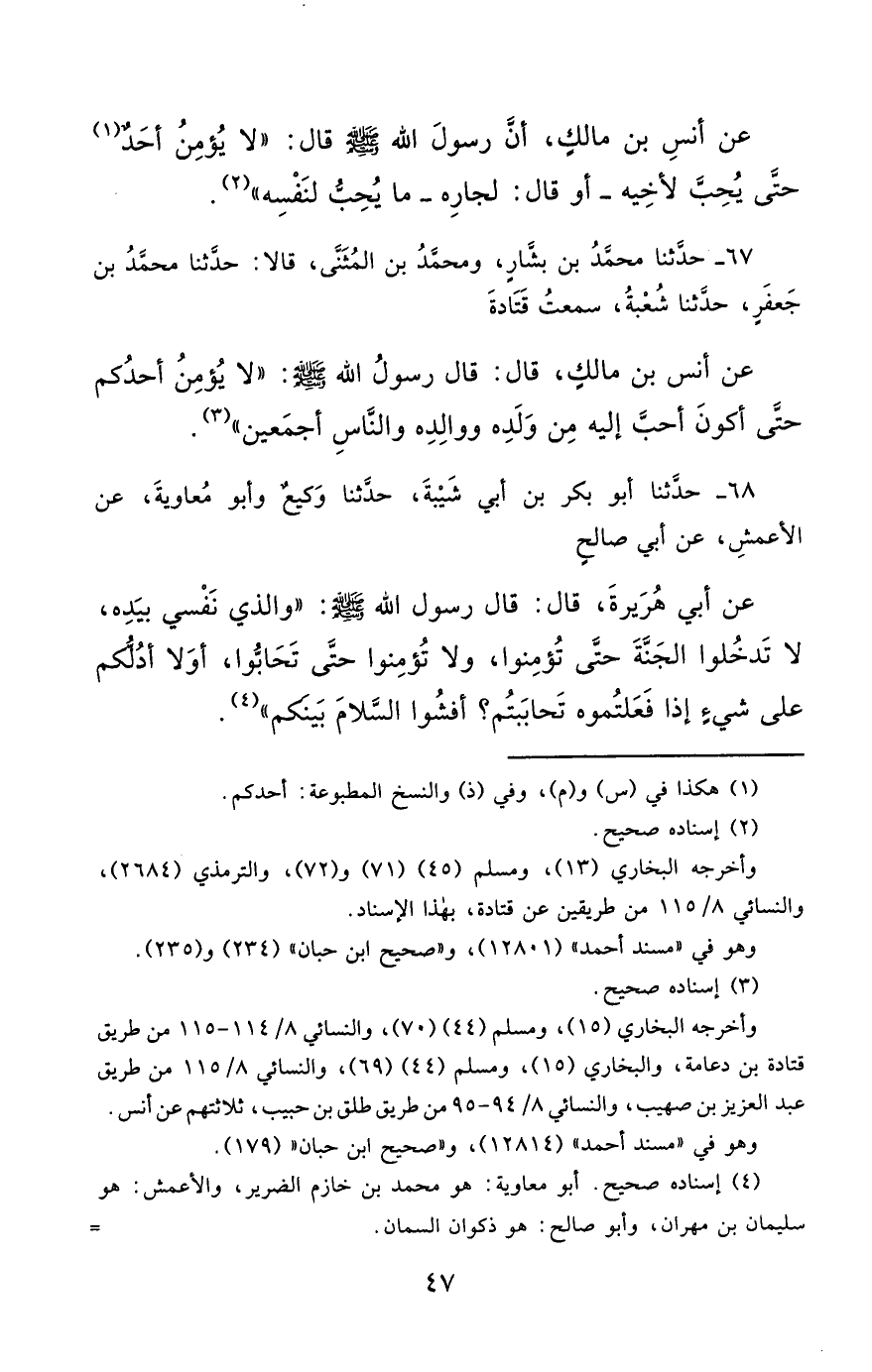 67- حَدَّثَنَا مُحَمَّدُ بْنُ بَشَّارٍ ، وَمُحَمَّدُ بْنُ الْمُثَنَّى ، قَالاَ : حَدَّثَنَا مُحَمَّدُ بْنُ جَعْفَرٍ ، حَدَّثَنَا شُعْبَةُ ، قَالَ : سَمِعْتُ قَتَادَةَ , عَنْ أَنَسِ بْنِ مَالِكٍ ، قَالَ : قَالَ رَسُولُ اللهِ صَلَّى الله عَليْهِ وسَلَّمَ : لاَ يُؤْمِنُ أَحَدُكُمْ حَتَّى أَكُونَ أَحَبَّ إِلَيْهِ مِنْ وَلَدِهِ ، وَوَالِدِهِ ، وَالنَّاسِ أَجْمَعِينَ.