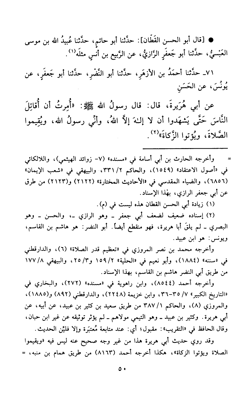 71- حَدَّثَنَا أَحْمَدُ بْنُ الأَزْهَرِ ، حَدَّثَنَا أَبُو النَّضْرِ ، حَدَّثَنَا أَبُو جَعْفَرٍ ، عَنْ يُونُسَ ، عَنِ الْحَسَنِ ، عَنْ أَبِي هُرَيْرَةَ ، قَالَ : قَالَ رَسُولُ اللهِ صَلَّى الله عَليْهِ وسَلَّمَ : أُمِرْتُ أَنْ أُقَاتِلَ النَّاسَ حَتَّى يَشْهَدُوا أَنْ لاَ إِلَهَ إِلاَّ اللَّهُ ، وَأَنِّي رَسُولُ اللهِ ، وَيُقِيمُوا الصَّلاَةَ ، وَيُؤْتُوا الزَّكَاةَ.