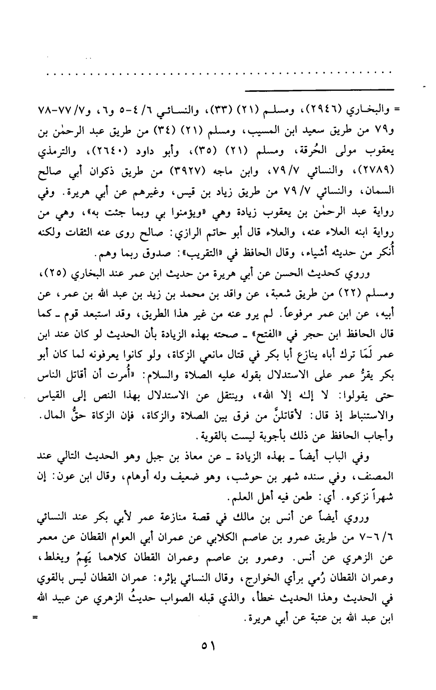 وروي كحديث الحسن عن أبي هريرة من حديث ابن عمر عند البخاري (25)، ومسلم (22) من طريق شعبة، عن واقد بن محمَّد بن زيد بن عبد الله بن عمر، عن أبيه، عن ابن عمر مرفوعًا. لم يرو عنه من غير هذا الطريق، وقد استبعد قوم -كما قال الحافظ ابن حجر في "الفتح"- صحته بهذه الزيادة بأن الحديث لو كان عند ابن عمر لَمَا ترك أباه ينازع أبا بكر في قتال مانعي الزكاة، ولو كانوا يعرفونه لما كان أبو بكر يقرُّ عمر على الاستدلال بقوله عليه الصلاة والسلام: "أُمرت أن أقاتل الناس حتى يقولوا: لا إله إلا الله"، وينتقل عن الاستدلال بهذا النص إلى القياس والاستنباط إذ قال: لأقاتلنَ من فرق بين الصلاة والزكاة، فإن الزكاة حق المال. وأجاب الحافظ عن ذلك بأجوبة ليست بالقوية.