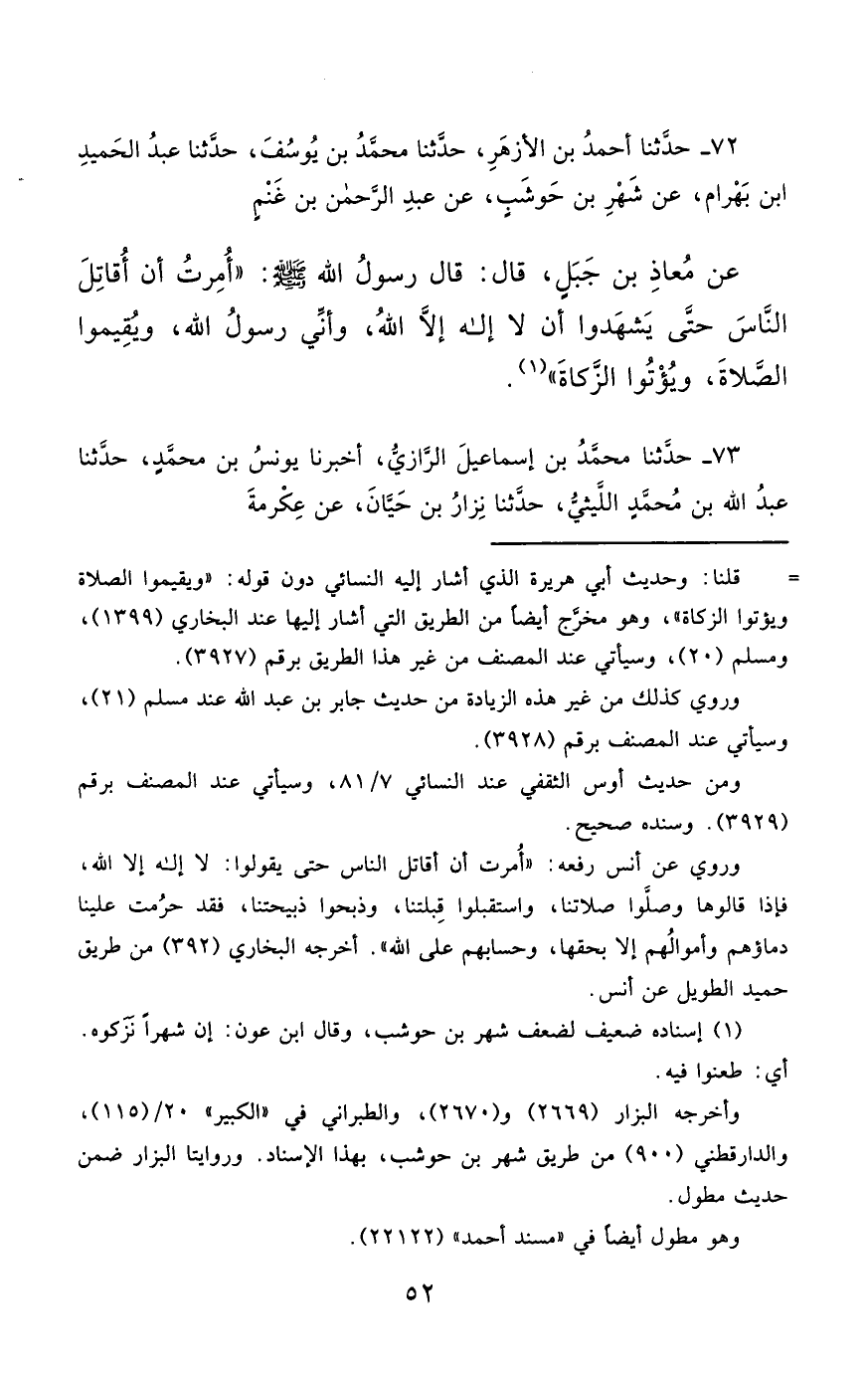 72- حَدَّثَنَا أَحْمَدُ بْنُ الأَزْهَرِ ، حَدَّثَنَا مُحَمَّدُ بْنُ يُوسُفَ ، حَدَّثَنَا عَبْدُ الْحَمِيدِ بْنُ بَهْرَامَ ، عَنْ شَهْرِ بْنِ حَوْشَبٍ ، عَنْ عَبْدِ الرَّحْمَنِ بْنِ غَنْمٍ ، عَنْ مُعَاذِ بْنِ جَبَلٍ ، قَالَ : قَالَ رَسُولُ اللهِ صَلَّى الله عَليْهِ وسَلَّمَ : أُمِرْتُ أَنْ أُقَاتِلَ النَّاسَ حَتَّى يَشْهَدُوا أَنْ لاَ إِلَهَ إِلاَّ اللَّهُ ، وَأَنِّي رَسُولُ اللهِ ، وَيُقِيمُوا الصَّلاَةَ ، وَيُؤْتُوا الزَّكَاةَ.