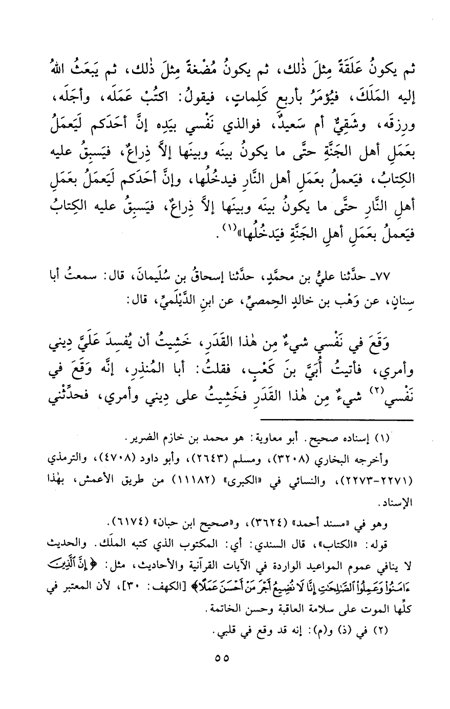 77- حَدَّثَنَا عَلِيُّ بْنُ مُحَمَّدٍ ، حَدَّثَنَا إِسْحَاقُ بْنُ سُلَيْمَانَ ، قَالَ : سَمِعْتُ أَبَا سِنَانٍ ، عَنْ وَهْبِ بْنِ خَالِدٍ الْحِمْصِيِّ ، عَنِ ابْنِ الدَّيْلَمِيِّ ، قَالَ : وَقَعَ فِي نَفْسِي شَيْءٌ مِنْ هَذَا الْقَدَرِ ، خَشِيتُ أَنْ يُفْسِدَ عَلَيَّ دِينِي وَأَمْرِي ، فَأَتَيْتُ أُبَيَّ بْنَ كَعْبٍ ، فَقُلْتُ : أَبَا الْمُنْذِرِ ، إِنَّهُ وَقَعَ فِي نَفْسِي شَيْءٌ مِنْ هَذَا الْقَدَرِ ، فَخَشِيتُ عَلَى دِينِي وَأَمْرِي ، فَحَدِّثْنِي مِنْ ذَلِكَ بِشَيْءٍ ، لَعَلَّ اللَّهَ أَنْ يَنْفَعَنِي بِهِ ، فَقَالَ : لَوْ أَنَّ اللَّهَ عَذَّبَ أَهْلَ سَمَاوَاتِهِ وَأَهْلَ أَرْضِهِ ، لَعَذَّبَهُمْ وَهُوَ غَيْرُ ظَالِمٍ لَهُمْ ، وَلَوْ رَحِمَهُمْ لَكَانَتْ رَحْمَتُهُ خَيْرًا لَهُمْ مِنْ أَعْمَالِهِمْ ، وَلَوْ كَانَ لَكَ جَبَلُ أُحُدٍ ذَهَبًا ، أَوْ مِثْلُ جَبَلِ أُحُدٍ تُنْفِقُهُ فِي سَبِيلِ اللهِ ، مَا قُبِلَ مِنْكَ , حَتَّى تُؤْمِنَ بِالْقَدَرِ ، فَتَعْلَمَ أَنَّ مَا أَصَابَكَ لَمْ يَكُنْ لِيُخْطِئَكَ ، وَأَنَّ مَا أَخْطَأَكَ لَمْ يَكُنْ لِيُصِيبَكَ ،