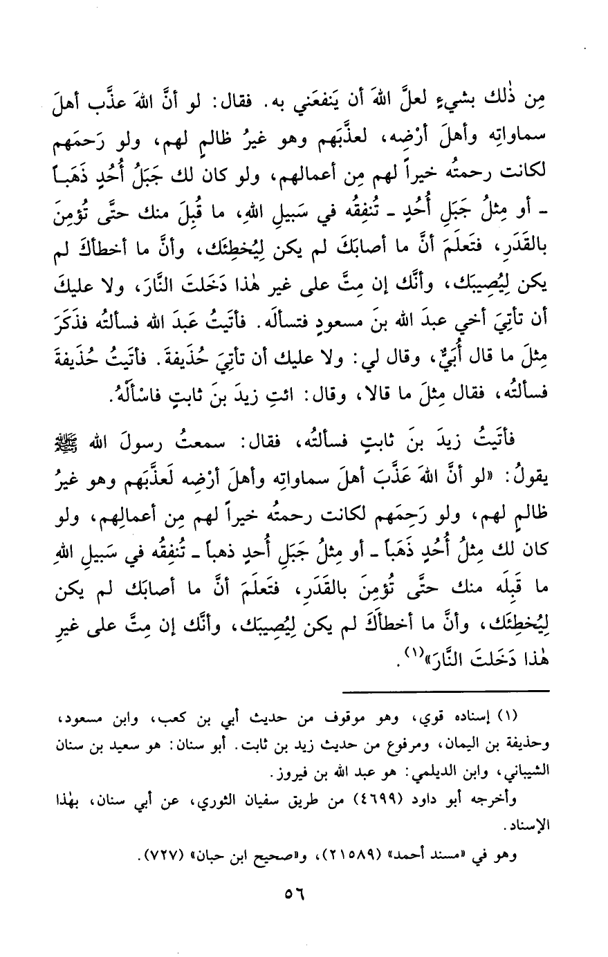 وَأَنَّكَ إِنْ مُتَّ عَلَى غَيْرِ هَذَا , دَخَلْتَ النَّارَ , وَلاَ عَلَيْكَ أَنْ تَأْتِيَ أَخِي عَبْدَ اللهِ بْنَ مَسْعُودٍ ، فَتَسْأَلَهُ ، فَأَتَيْتُ عَبْدَ اللهِ ، فَسَأَلْتُهُ ، فَذَكَرَ مِثْلَ مَا قَالَ أُبَيٌّ , وَقَالَ لِي : وَلاَ عَلَيْكَ أَنْ تَأْتِيَ حُذَيْفَةَ ، فَأَتَيْتُ حُذَيْفَةَ ، فَسَأَلْتُهُ ، فَقَالَ مِثْلَ مَا قَالاَ ، وَقَالَ : ائْتِ زيْدَ بْنَ ثابتٍ ، فَاسْأَلْهُ ، فَأَتَيْتُ زيْدَ بْنَ ثابتٍ ، فَسَأَلْتُهُ ، فَقَالَ : سَمِعْتُ رَسُولَ اللهِ صلَّى اللَّهُ عليْهِ وسلَّمَ يَقُولُ : لَوْ أَنَّ اللَّهَ عذَّبَ أهْلَ سَمَاوَاتِهِ وأهْلَ أرْضِهِ ، لَعَذَّبَهُمْ وَهُوَ غيْرُ ظَالِمٍ لَهُمْ ، وَلَوْ رَحِمَهُمْ لَكَانَتْ رَحْمَتُهُ خيْرًا لَهُمْ مِنْ أَعْمَالِهِمْ ، وَلَوْ كَانَ لَكَ مِثْلُ أُحُدٍ ذَهَبًا ، أوْ مِثْلُ جَبَلِ أُحُدٍ ذَهَبًا تُنْفِقُهُ فِي سَبِيلِ اللهِ ، مَا قَبِلَهُ مِنْكَ , حتَّى تُؤْمِنَ بِالْقَدَرِ ، فَتَعْلَمَ أنَّ مَا أَصَابَكَ لَمْ يَكُنْ لِيُخْطِئَكَ ، وَأَنَّ مَا أَخْطَأَكَ لَمْ يَكُنْ لِيُصِيبَكَ ، وَأَنَّكَ إِنْ مِتَّ عَلَى غيْرِ هَذَا دَخَلْتَ النَّارَ.