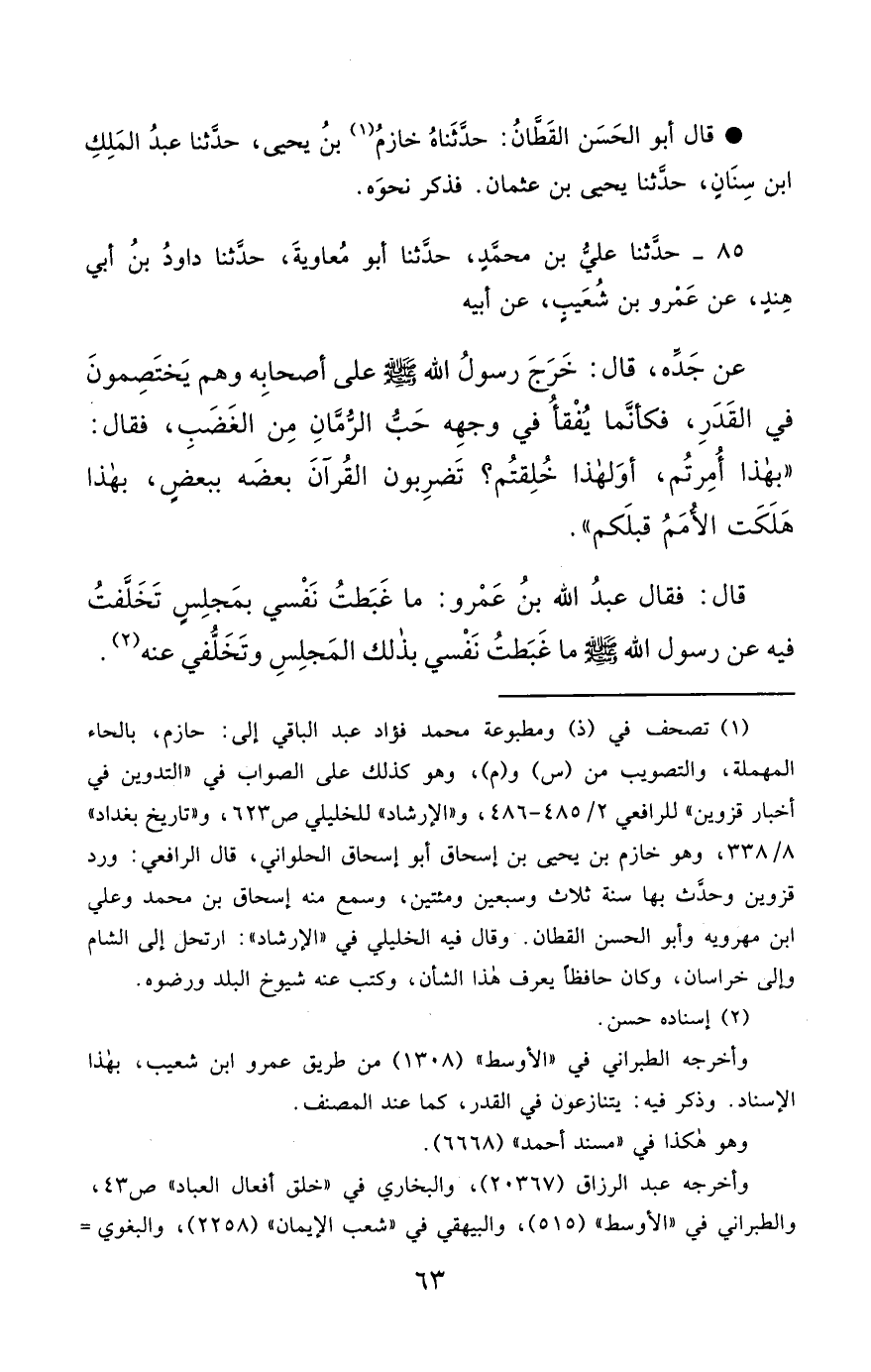 85- حَدَّثَنَا عَلِيُّ بْنُ مُحَمَّدٍ ، حَدَّثَنَا أَبُو مُعَاوِيَةَ ، حَدَّثَنَا دَاوُدُ بْنُ أَبِي هِنْدٍ ، عَنْ عَمْرِو بْنِ شُعَيْبٍ ، عَنْ أَبِيهِ ، عَنْ جَدِّهِ ، قَالَ : خَرَجَ رَسُولُ اللهِ صَلَّى الله عَليْهِ وسَلَّمَ عَلَى أَصْحَابِهِ ، وَهُمْ يَخْتَصِمُونَ فِي الْقَدَرِ ، فَكَأَنَّمَا يُفْقَأُ فِي وَجْهِهِ حَبُّ الرُّمَّانِ مِنَ الْغَضَبِ ، فَقَالَ : بِهَذَا أُمِرْتُمْ ، أَوْ لِهَذَا خُلِقْتُمْ ، تَضْرِبُونَ الْقُرْآنَ بَعْضَهُ بِبَعْضٍ ، بِهَذَا هَلَكَتِ الأُمَمُ قَبْلَكُمْ , قَالَ : فَقَالَ عَبْدُ اللهِ بْنُ عَمْرٍو : مَا غَبَطْتُ نَفْسِي بِمَجْلِسٍ تَخَلَّفْتُ فِيهِ عَنْ رَسُولِ اللهِ صَلَّى الله عَليْهِ وسَلَّمَ ، مَا غَبَطْتُ نَفْسِي بِذَلِكَ الْمَجْلِسِ وَتَخَلُّفِي عَنْهُ.