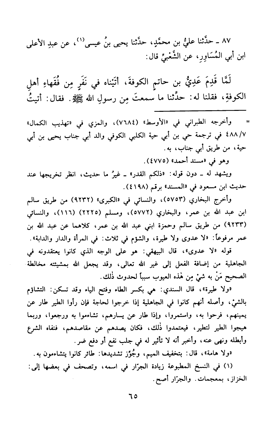 87- حَدَّثَنَا عَلِيُّ بْنُ مُحَمَّدٍ ، حَدَّثَنَا يَحْيَى بْنُ عِيسَى ، عَنْ عَبْدِ الأَعْلَى بْنِ أَبِي الْمُسَاوِرِ ، عَنِ الشَّعْبِيِّ ، قَالَ : لَمَّا قَدِمَ عَدِيُّ بْنُ حَاتِمٍ الْكُوفَةَ ، أَتَيْنَاهُ فِي نَفَرٍ مِنْ فُقَهَاءِ أَهْلِ الْكُوفَةِ ، فَقُلْنَا لَهُ : حَدِّثْنَا مَا سَمِعْتَ مِنْ رَسُولِ اللهِ صَلَّى الله عَليْهِ وسَلَّمَ ، فَقَالَ : أَتَيْتُ النَّبِيَّ صَلَّى الله عَليْهِ وسَلَّمَ فَقَالَ : يَا عَدِيَّ بْنَ حَاتِمٍ ، أَسْلِمْ تَسْلَمْ ، قُلْتُ : وَمَا الإِسْلاَمُ ؟ فَقَالَ : تَشْهَدُ أَنْ لاَ إِلَهَ إِلاَّ اللَّهُ ، وَأَنِّي رَسُولُ اللهِ ، وَتُؤْمِنُ بِالأَقْدَارِ كُلِّهَا ، خيْرِهَا وَشَرِّهَا ، حُلْوِهَا وَمُرِّهَا.