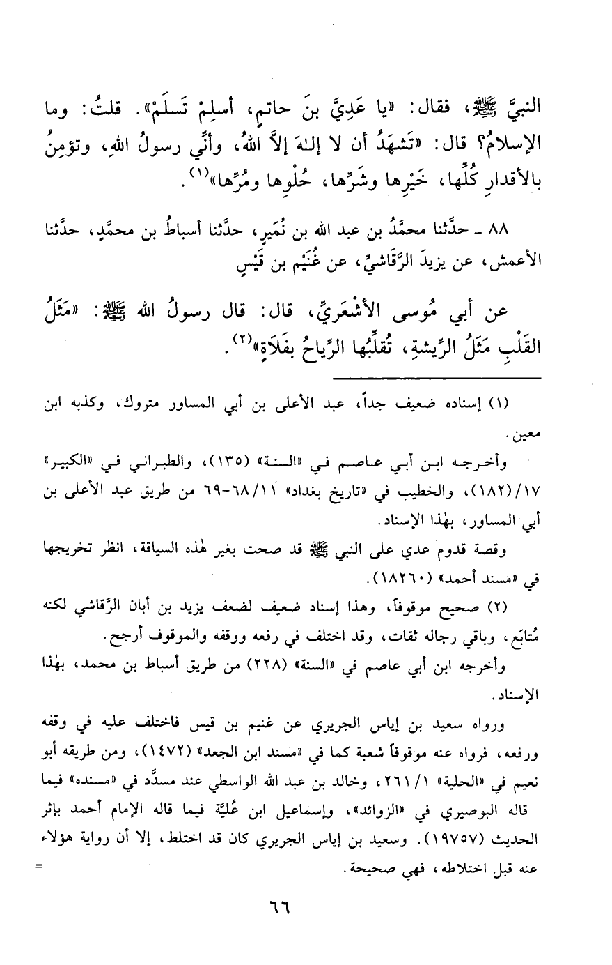 88- حَدَّثَنَا مُحَمَّدُ بْنُ عَبْدِ اللهِ بْنِ نُمَيْرٍ ، حَدَّثَنَا أَسْبَاطُ بْنُ مُحَمَّدٍ ، حَدَّثَنَا الأَعْمَشُ ، عَنْ يَزِيدَ الرَّقَاشِيِّ ، عَنْ غُنَيْمِ بْنِ قَيْسٍ ، عَنْ أَبِي مُوسَى الأَشْعَرِيِّ ، قَالَ : قَالَ رَسُولُ اللهِ صَلَّى الله عَليْهِ وسَلَّمَ : مَثَلُ الْقَلْبِ مَثَلُ الرِّيشَةِ , تُقَلِّبُهَا الرِّيَاحُ بِفَلاَةٍ.