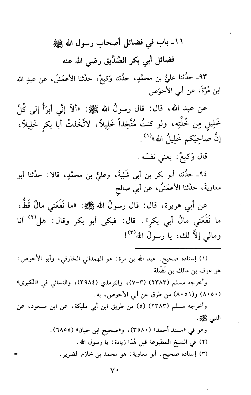 93- حَدَّثَنَا عَلِيُّ بْنُ مُحَمَّدٍ ، حَدَّثَنَا وَكِيعٌ ، حَدَّثَنَا الأَعْمَشُ ، عَنْ عَبْدِ اللهِ بْنِ مُرَّةَ ، عَنْ أَبِي الأَحْوَصِ ، عَنْ عَبْدِ اللهِ ، قَالَ : قَالَ رَسُولُ اللهِ صَلَّى الله عَليْهِ وسَلَّمَ : أَلاَ إِنِّي أَبْرَأُ إِلَى كُلِّ خَلِيلٍ مِنْ خُلَّتِهِ ، وَلَوْ كُنْتُ مُتَّخِذًا خَلِيلاً ، لاَتَّخَذْتُ أَبَا بَكْرٍ خَلِيلاً ، إِنَّ صَاحِبَكُمْ خَلِيلُ اللهِ.