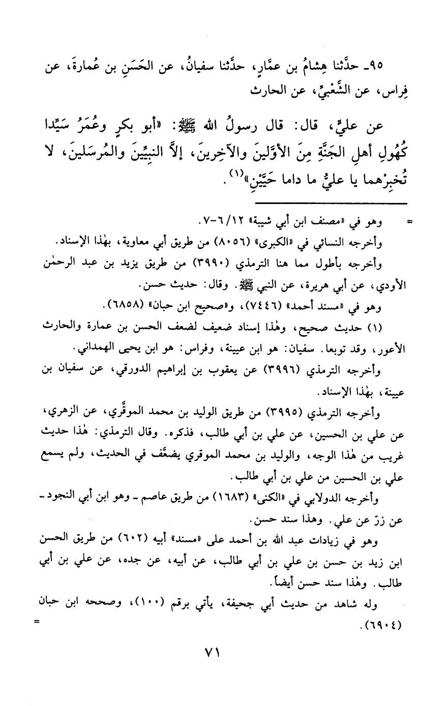 95- حَدَّثَنَا هِشَامُ بْنُ عَمَّارٍ ، حَدَّثَنَا سُفْيَانُ ، عَنِ الْحَسَنِ بْنِ عُمَارَةَ ، عَنْ فِرَاسٍ ، عَنِ الشَّعْبِيِّ ، عَنِ الْحَارِثِ ، عَنْ عَلِيٍّ ، قَالَ : قَالَ رَسُولُ اللهِ صَلَّى الله عَليْهِ وسَلَّمَ : أَبُو بَكْرٍ وَعُمَرُ سَيِّدَا كُهُولِ أَهْلِ الْجَنَّةِ , مِنَ الأَوَّلِينَ وَالآخِرِينَ ، إِلاَّ النَّبِيِّينَ وَالْمُرْسَلِينَ ، لاَ تُخْبِرْهُمَا يَا عَلِيُّ مَا دَامَا حَيَّيْنِ.