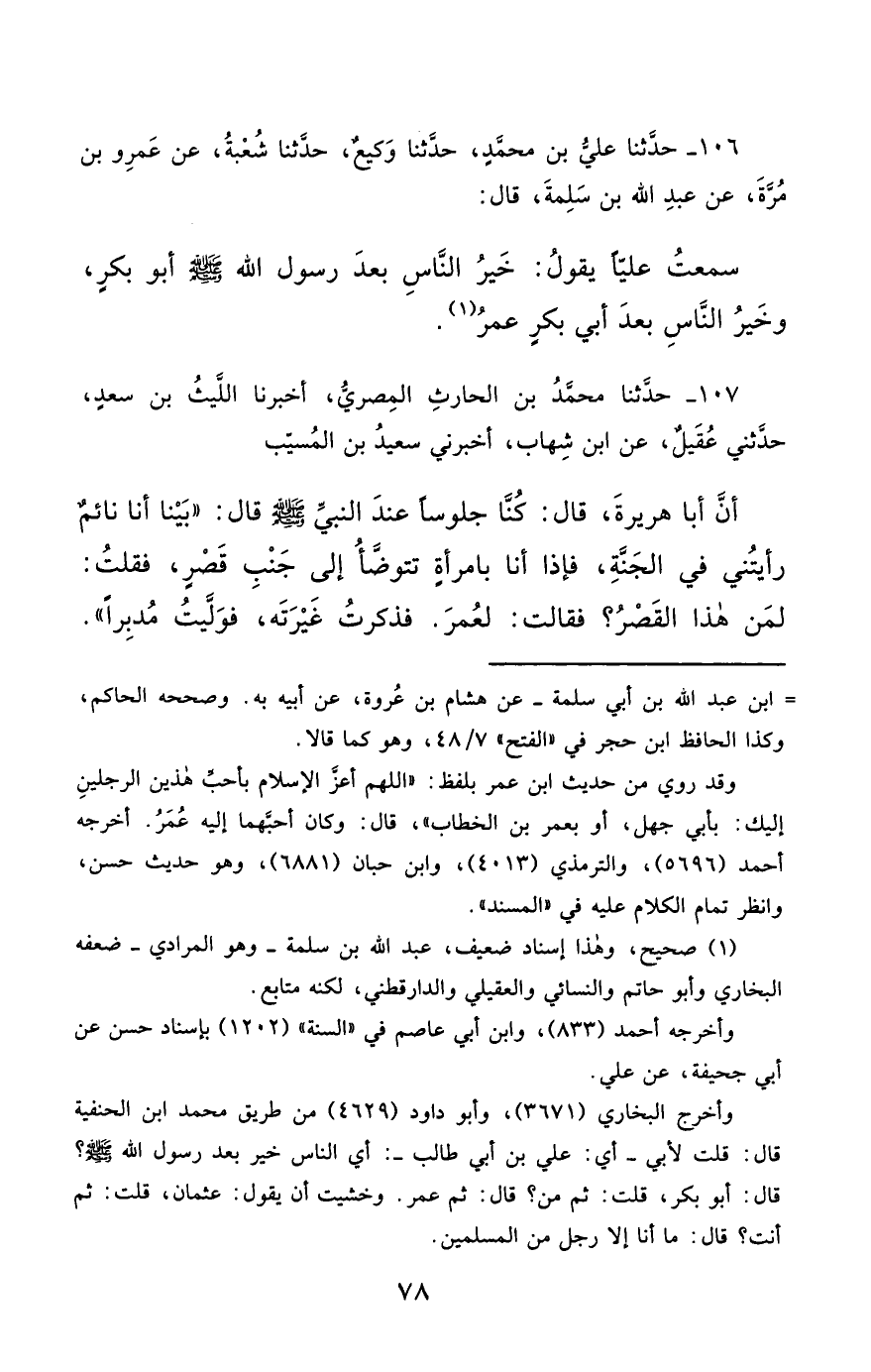 106- حَدَّثَنَا عَلِيُّ بْنُ مُحَمَّدٍ ، حَدَّثَنَا وَكِيعٌ ، حَدَّثَنَا شُعْبَةُ ، عَنْ عَمْرِو بْنِ مُرَّةَ ، عَنْ عَبْدِ اللهِ بْنِ سَلِمَةَ ، قَالَ : سَمِعْتُ عَلِيًّا يَقُولُ : خَيْرُ النَّاسِ بَعْدَ رَسُولِ اللهِ صَلَّى الله عَليْهِ وسَلَّمَ أَبُو بَكْرٍ ، وَخَيْرُ النَّاسِ بَعْدَ أَبِي بَكْرٍ عُمَرُ.