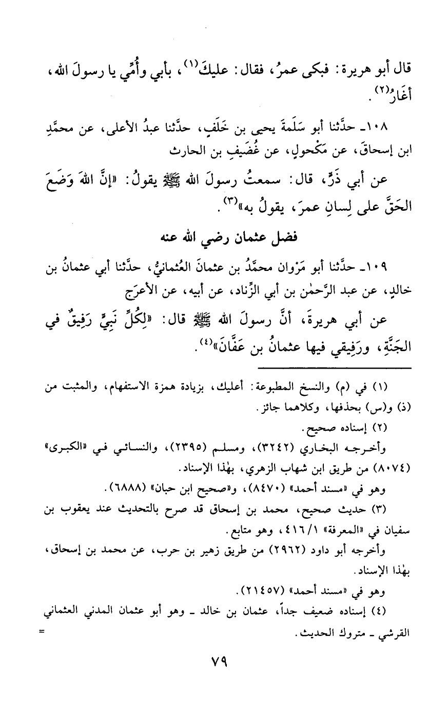 109- حَدَّثَنَا أَبُو مَرْوَانَ مُحَمَّدُ بْنُ عُثْمَانَ الْعُثْمَانِيُّ ، حَدَّثَنَا أَبِي عُثْمَانُ بْنُ خَالِدٍ ، عَنْ عَبْدِ الرَّحْمَنِ بْنِ أَبِي الزِّنَادِ ، عَنْ أَبِيهِ ، عَنِ الأَعْرَجِ ، عَنْ أَبِي هُرَيْرَةَ ، أَنَّ رَسُولَ اللهِ صَلَّى الله عَليْهِ وسَلَّمَ قَالَ : لِكُلِّ نَبِيٍّ رَفِيقٌ فِي الْجَنَّةِ ، وَرَفِيقِي فِيهَا عُثْمَانُ بْنُ عَفَّانَ.