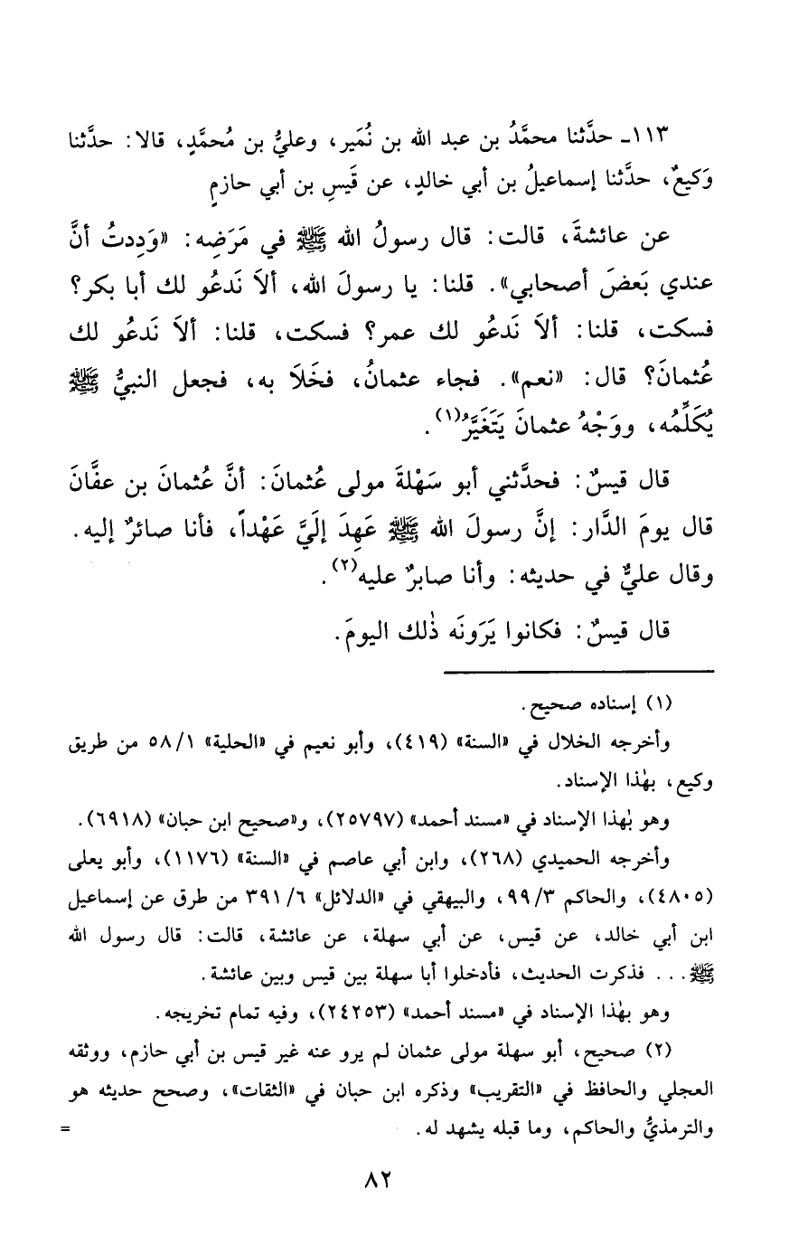 113- حَدَّثَنَا مُحَمَّدُ بْنُ عَبْدِ اللهِ بْنِ نُمَيْرٍ ، وَعَلِيُّ بْنُ مُحَمَّدٍ ، قَالاَ : حَدَّثَنَا وَكِيعٌ ، حَدَّثَنَا إِسْمَاعِيلُ بْنُ أَبِي خَالِدٍ ، عَنْ قَيْسِ بْنِ أَبِي حَازِمٍ ، عَنْ عَائِشَةَ قَالَتْ : قَالَ رَسُولُ اللهِ صَلَّى الله عَليْهِ وسَلَّمَ فِي مَرَضِهِ : وَدِدْتُ أَنَّ عِنْدِي بَعْضَ أَصْحَابِي , قُلْنَا : يَا رَسُولَ اللهِ ، أَلاَ نَدْعُو لَكَ أَبَا بَكْرٍ ؟ فَسَكَتَ ، قُلْنَا : أَلاَ نَدْعُو لَكَ عُمَرَ ؟ فَسَكَتَ , قُلْنَا : أَلاَ نَدْعُو لَكَ عُثْمَانَ ؟ قَالَ : نَعَمْ ، فَجَاءَ عُثْمَانُ ، فَخَلاَ بِهِ ، فَجَعَلَ النَّبِيُّ صَلَّى الله عَليْهِ وسَلَّمَ يُكَلِّمُهُ ، وَوَجْهُ عُثْمَانَ يَتَغَيَّرُ.