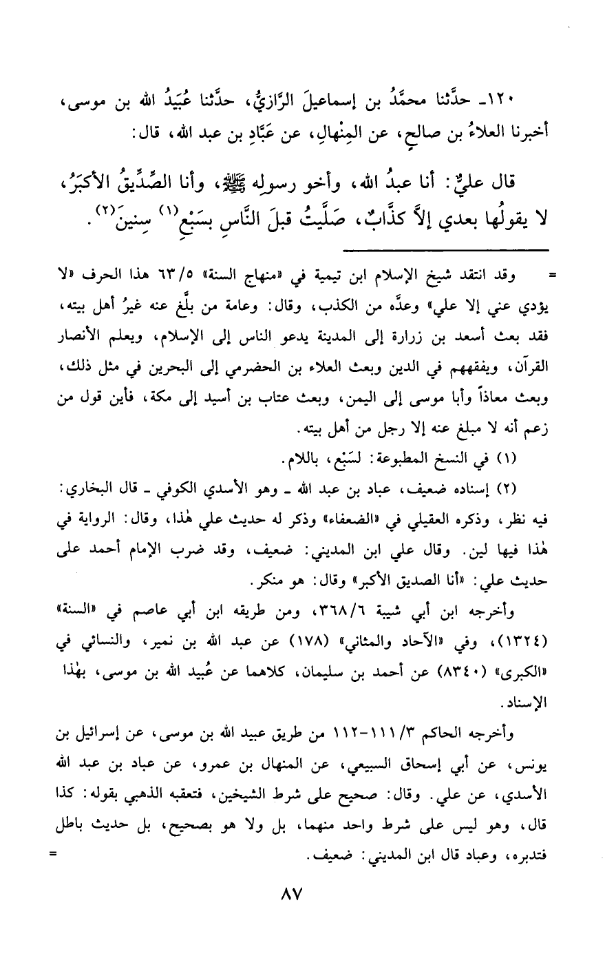 120- حَدَّثَنَا مُحَمَّدُ بْنُ إِسْمَاعِيلَ الرَّازِيُّ ، حَدَّثَنَا عُبَيْدُ اللهِ بْنُ مُوسَى ، أَخْبَرَنَا الْعَلاَءُ بْنُ صَالِحٍ ، عَنِ الْمِنْهَالِ ، عَنْ عَبَّادِ بْنِ عَبْدِ اللهِ ، قَالَ : قَالَ عَلِيٌّ : أَنَا عَبْدُ اللهِ , وَأَخُو رَسُولِهِ صَلَّى الله عَليْهِ وسَلَّمَ ، وَأَنَا الصِّدِّيقُ الأَكْبَرُ ، لاَ يَقُولُهَا بَعْدِي إِلاَّ كَذَّابٌ ، صَلَّيْتُ قَبْلَ النَّاسِ بِسَبْعِ سِنِينَ.