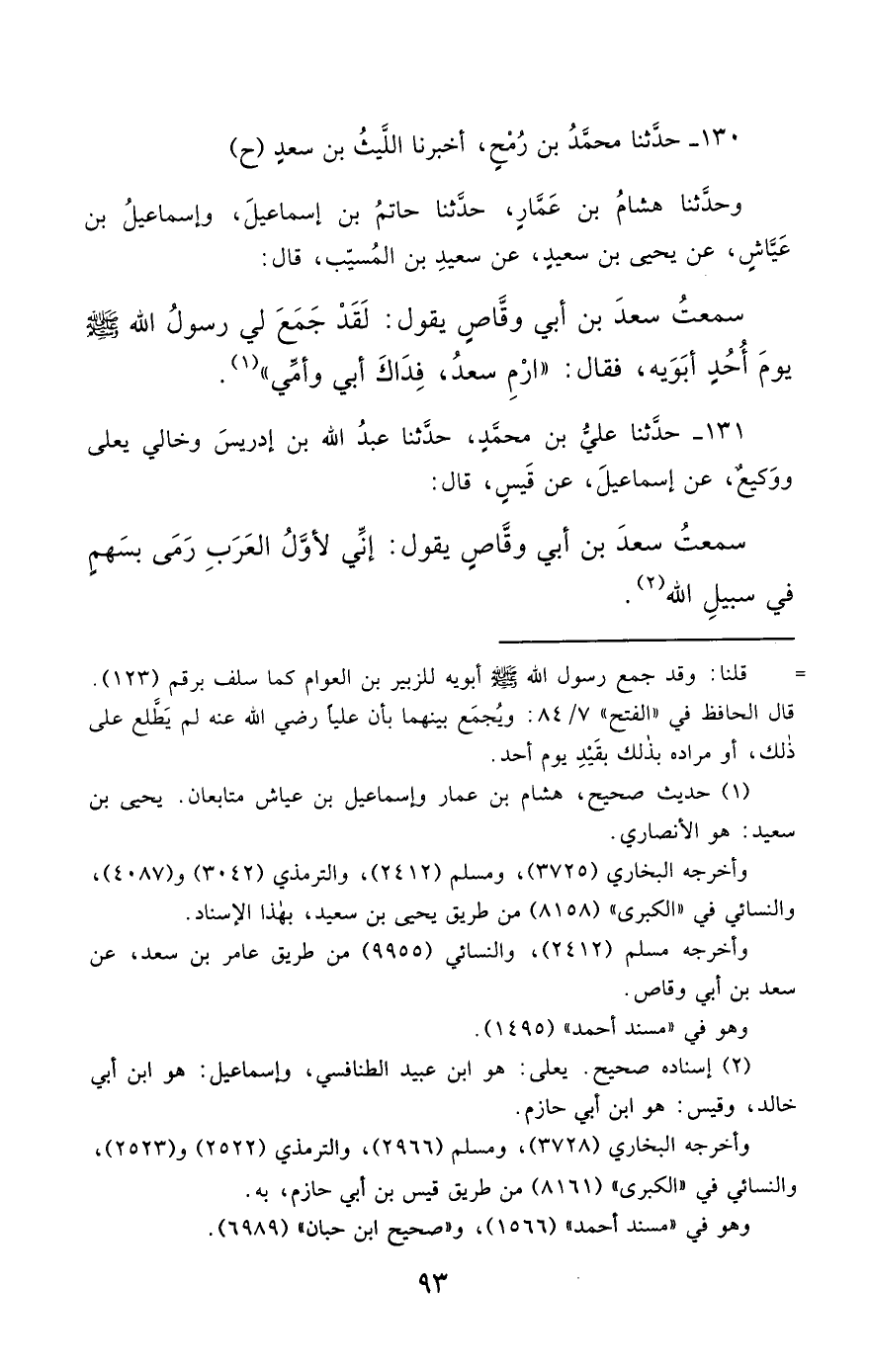 130- حَدَّثَنَا مُحَمَّدُ بْنُ رُمْحٍ ، أَخْبَرَنَا اللَّيْثُ بْنُ سَعْدٍ (ح) وَحَدَّثَنَا هِشَامُ بْنُ عَمَّارٍ ، حَدَّثَنَا حَاتِمُ بْنُ إِسْمَاعِيلَ ، وَإِسْمَاعِيلُ بْنُ عَيَّاشٍ ، عَنْ يَحْيَى بْنِ سَعِيدٍ ، عَنْ سَعِيدِ بْنِ الْمُسَيَّبِ ، قَالَ : سَمِعْتُ سَعْدَ بْنَ أَبِي وَقَّاصٍ يَقُولُ : لَقَدْ جَمَعَ لِي رَسُولُ اللهِ صَلَّى الله عَليْهِ وسَلَّمَ يَوْمَ أُحُدٍ أَبَوَيْهِ ، فَقَالَ : ارْمِ سَعْدُ ، فِدَاكَ أَبِي وَأُمِّي.