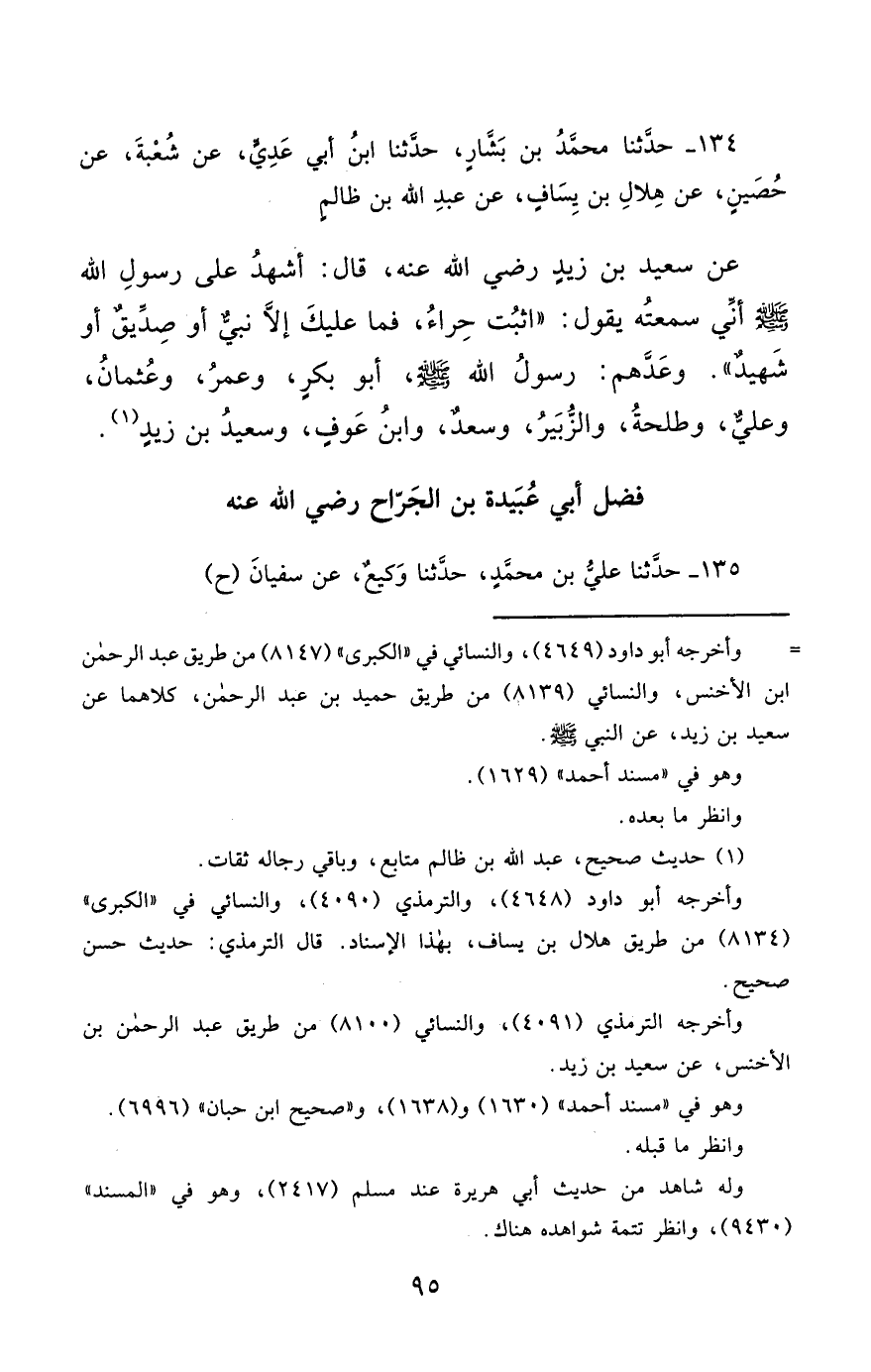 134- حَدَّثَنَا مُحَمَّدُ بْنُ بَشَّارٍ ، حَدَّثَنَا ابْنُ أَبِي عَدِيٍّ ، عَنْ شُعْبَةَ ، عَنْ حُصَيْنٍ ، عَنْ هِلاَلِ بْنِ يَسَافٍ ، عَنْ عَبْدِ اللهِ بْنِ ظَالِمٍ ، عَنْ سَعِيدِ بْنِ زَيْدٍ رَضِيَ اللهُ عَنْهُ ، قَالَ : أَشْهَدُ عَلَى رَسُولِ اللهِ صَلَّى الله عَليْهِ وسَلَّمَ أَنِّي سَمِعْتُهُ يَقُولُ : اثْبُتْ حِرَاءُ ، فَمَا عَلَيْكَ إِلاَّ نَبِيٌّ ، أَوْ صِدِّيقٌ ، أَوْ شَهِيدٌ , وَعَدَّهُمْ : رَسُولُ اللهِ صَلَّى الله عَليْهِ وسَلَّمَ , أَبُو بَكْرٍ ، وَعُمَرُ ، وَعُثْمَانُ ، وَعَلِيٌّ ، وَطَلْحَةُ ، وَالزُّبَيْرُ ، وَسَعْدٌ ، وَابْنُ عَوْفٍ ، وَسَعِيدُ بْنُ زَيْدٍ.