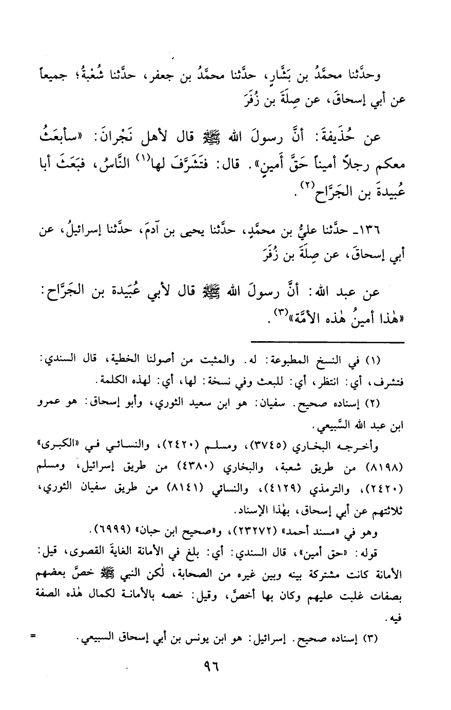 136- حَدَّثَنَا عَلِيُّ بْنُ مُحَمَّدٍ ، حَدَّثَنَا يَحْيَى بْنُ آدَمَ ، حَدَّثَنَا إِسْرَائِيلُ ، عَنْ أَبِي إِسْحَاقَ ، عَنْ صِلَةَ بْنِ زُفَرَ ، عَنْ عَبْدِ اللهِ ، أَنَّ رَسُولَ اللهِ صَلَّى الله عَليْهِ وسَلَّمَ قَالَ لأَبِي عُبَيْدَةَ بْنِ الْجَرَّاحِ : هَذَا أَمِينُ هَذِهِ الأُمَّةِ.