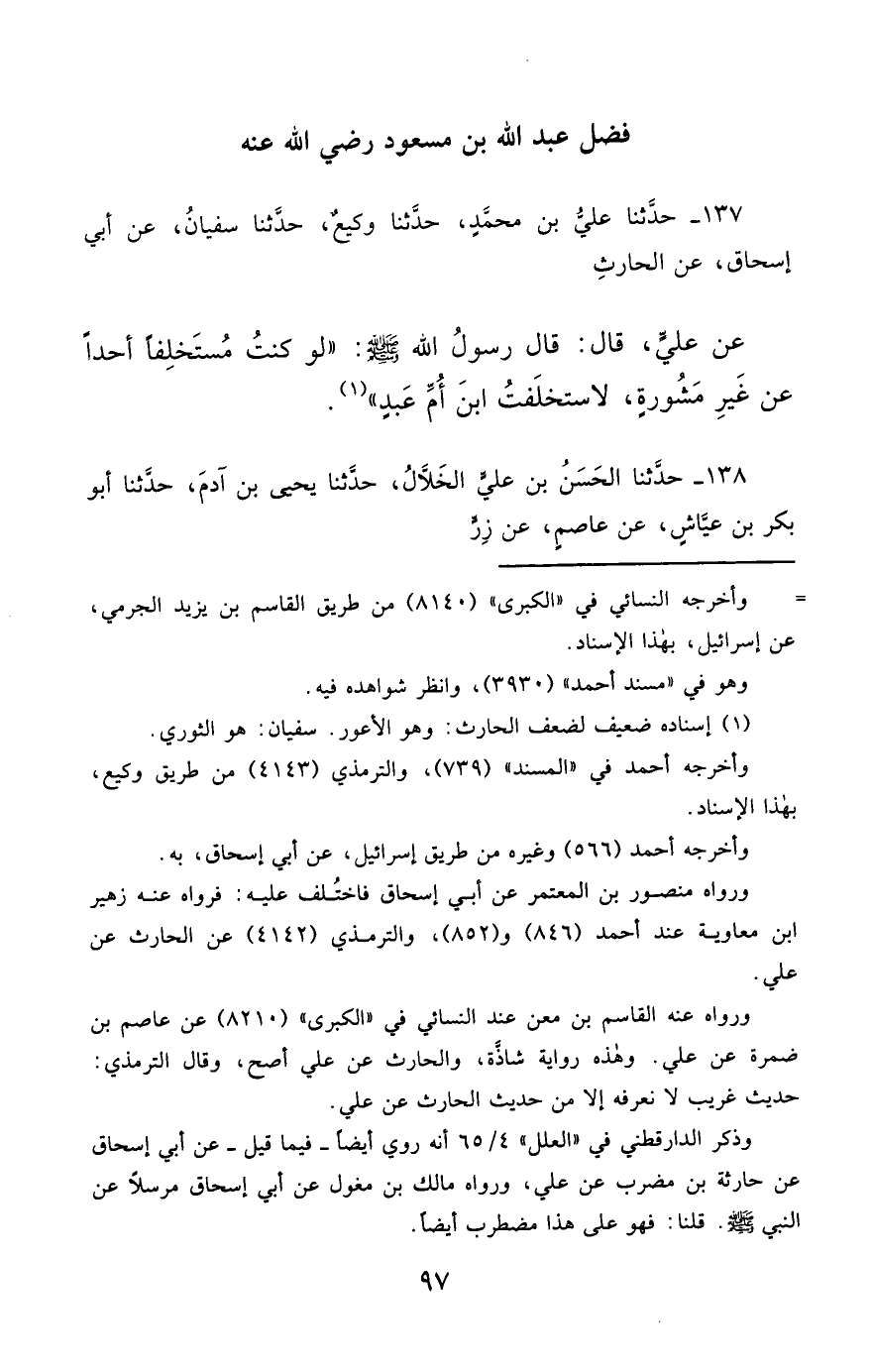 137- حَدَّثَنَا عَلِيُّ بْنُ مُحَمَّدٍ ، حَدَّثَنَا وَكِيعٌ ، حَدَّثَنَا سُفْيَانُ ، عَنْ أَبِي إِسْحَاقَ ، عَنِ الْحَارِثِ ، عَنْ عَلِيٍّ ، قَالَ : قَالَ رَسُولُ اللهِ صَلَّى الله عَليْهِ وسَلَّمَ : لَوْ كُنْتُ مُسْتَخْلِفًا أَحَدًا عَنْ غَيْرِ مَشُورَةٍ ، لاَسْتَخْلَفْتُ ابْنَ أُمِّ عَبْدٍ.