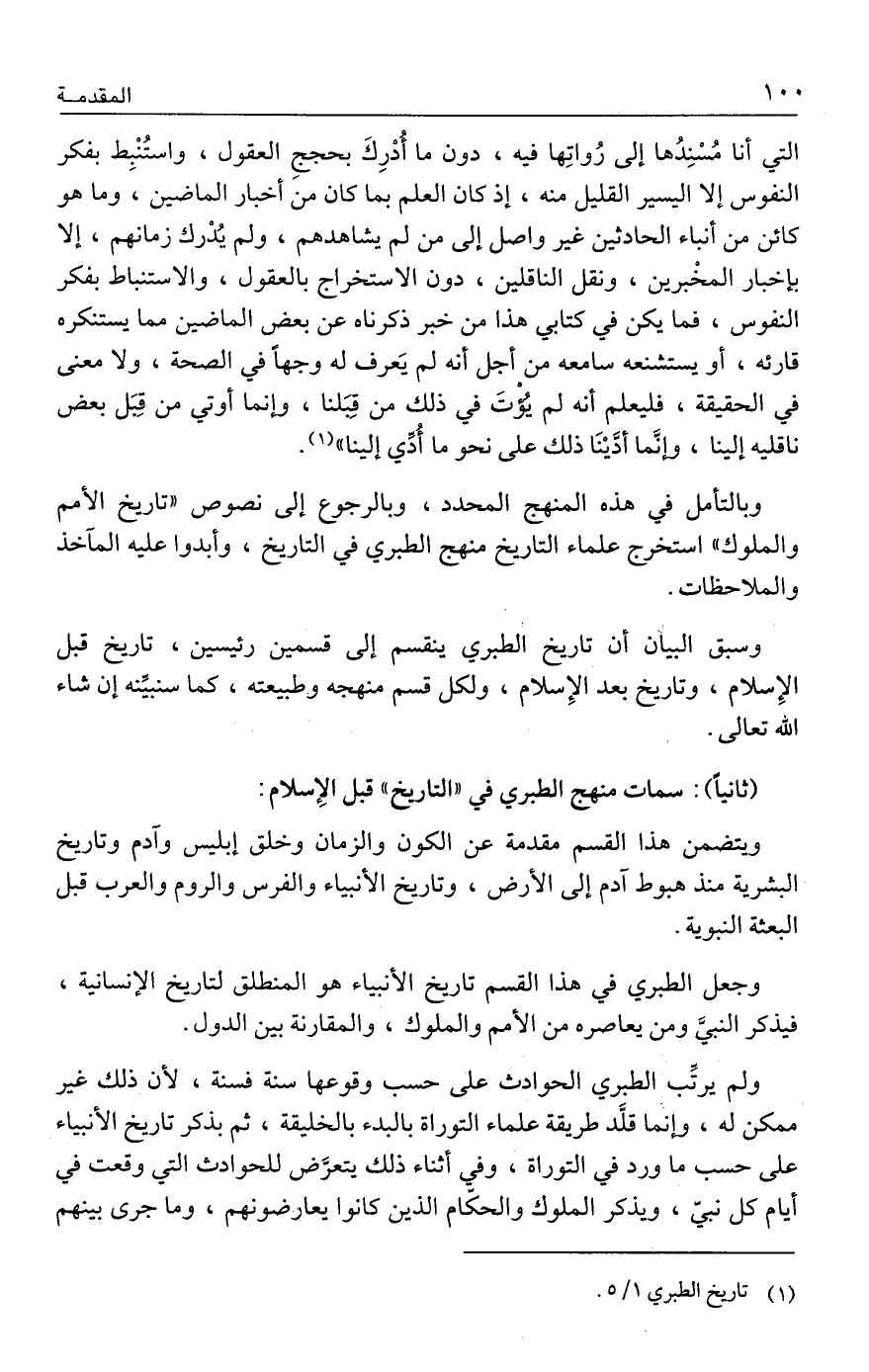 التي أنا مُسْنِدُها إلى رُواتِها فيه، دون ما أُدْرِكَ بحججِ العقول، واستُنْبِط بفكر النفوس إلا اليسير القليل منه، إذ كان العلم بما كان من أخبار الماضين، وما هو كائن من أنباء الحادثين غير واصل إلى من لم يشاهدهم، ولم يُدْرك زمانهم، إلا بإخبار المخْبرين، ونقل الناقلين، دون الاستخراج بالعقول، والاستنباط بفكر النفوس، فما يكن في كتابي هذا من خبر ذكرناه عن بعض الماضين مما يستنكره قارئه، أو يستشنعه سامعه من أجل أنه لم يَعرف له وجهًا في الصحة، ولا معنى في الحقيقة، فليعلم أنه لم يُؤتَ في ذلك من قِبَلنا، وإنما أوتي من قِبَل بعض ناقليه إلينا، وإنَّما أدَّينَا ذلك على نحو ما أُدِّي إلينا" (١).