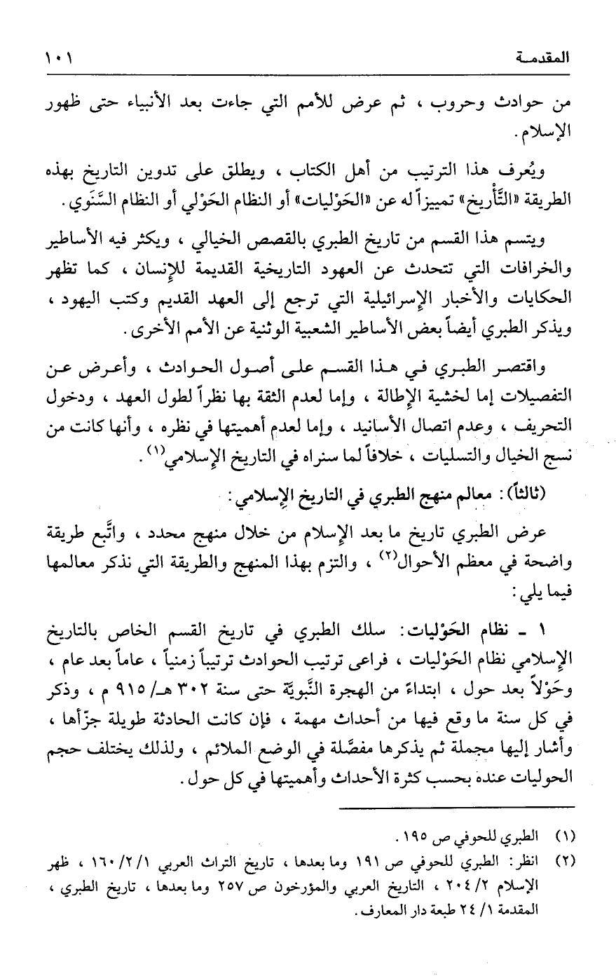 (٢) انظر: الطبري للحوفي ص ١٩١ وما بعدها، تاريخ التراث العربي ١/ ٢ / ١٦٠، ظهر الإسلام ٢/ ٢٠٤، التاريخ العربي والمؤرخون ص ٢٥٧ وما بعدها، تاريخ الطبري، المقدمة ١/ ٢٤ طبعة دار المعارف.