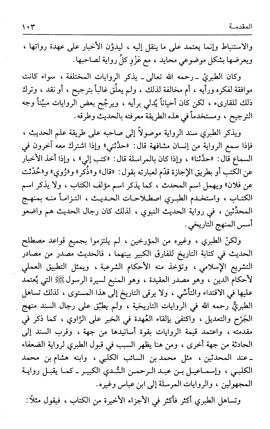 ويذكر الطبري سند الرواية موصولًا إلى صاحبه على طريقة علم الحديث، فإذا سمع الرواية من إنسان مشافهة قال: "حدَّثني" وإذا اشترك معه آخرون في السماع قال: "حدَّثنا"، وإذا كان بالمراسلة قال: "كتب إلي"، وإذا أخذ الأخبار عن الكتب أو بطريق الإجازة قدَّم لعبارته بقول: "قال" و"ذُكر" و "رُوي" و"حُدّثت عن فلان" ويهمل اسم المحدث، كما يذكر اسم مؤلف الكتاب، ولا يذكر اسم الكتاب، واستخدم الطبري اصطلاحات الحديث، التزامًا منه بمنهج المحدِّثين، في رواية الحديث النبوي، لذلك كان رجال الحديث هم واضعو أسس المنهج التاريخي.