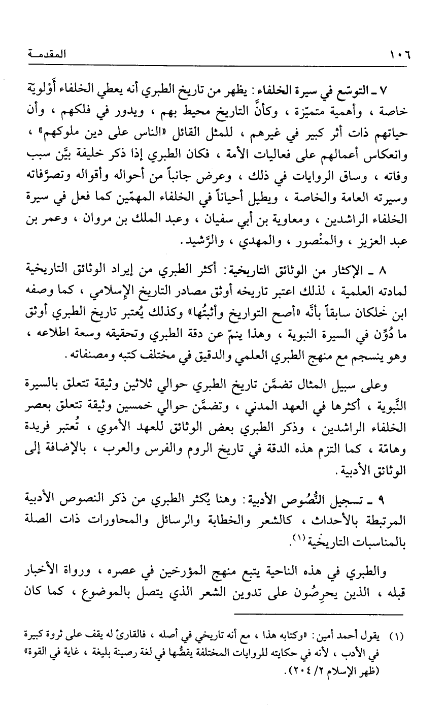 ٩ - تسجيل النُّصُوص الأدبية: وهنا يُكثر الطبري من ذكر النصوص الأدبية المرتبطة بالأحداث، كالشعر والخطابة والرسائل والمحاورات ذات الصلة بالمناسبات التاريخية (١).