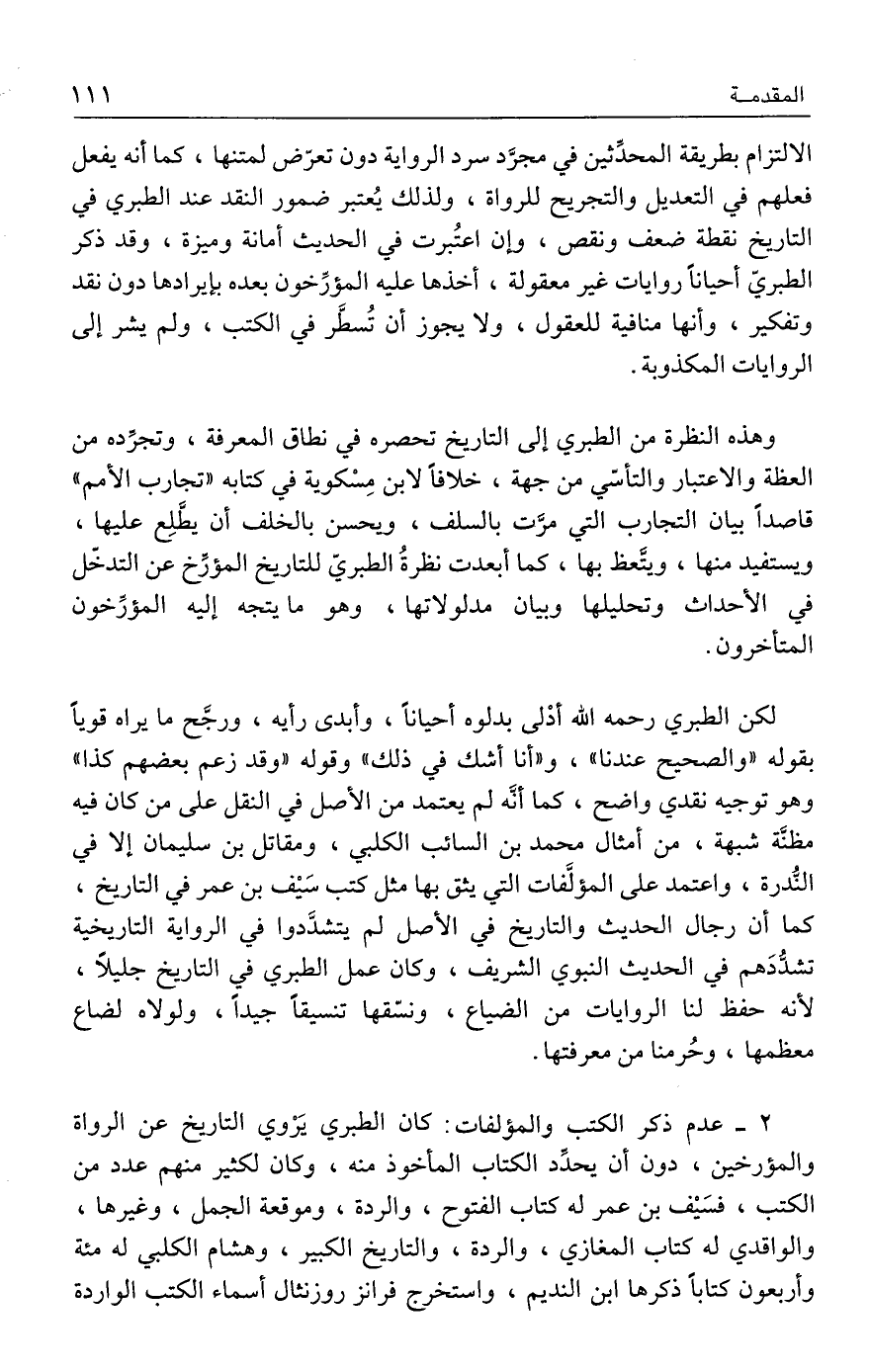 ٢ - عدم ذكر الكتب والمؤلفات: كان الطبري يَرْوي التاريخ عن الرواة والمؤرخين، دون أن يحدِّد الكتاب المأخوذ منه، وكان لكثير منهم عدد من الكتب، فسَيف بن عمر له كتاب الفتوح، والردة، وموقعة الجمل، وغيرها، والواقدي له كتاب المغازي، والردة، والتاريخ الكبير، وهشام الكلبي له مئة وأربعون كتابًا ذكرها ابن النديم، واستخرج فرانز روزنثال أسماء الكتب الواردة