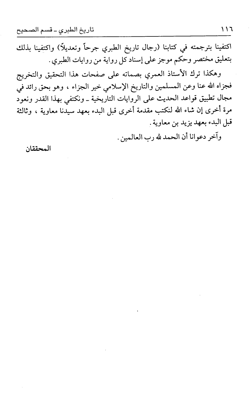 وهكذا ترك الأستاذ العمري بصماته على صفحات هذا التحقيق والتخريج فجزاه الله عنا وعن المسلمين والتاربح الإسلامي خير الجزاء، وهو بحق رائد في مجال تطبيق قواعد الحديث على الروايات التاريخية - ونكتفي بهذا القدر ونعود مرة أخرى إن شاء الله لنكتب مقدمة أخرى قبل البدء بعهد سيدنا معاوية، وثالثة قبل البدء بعهد يزيد بن معاوية.