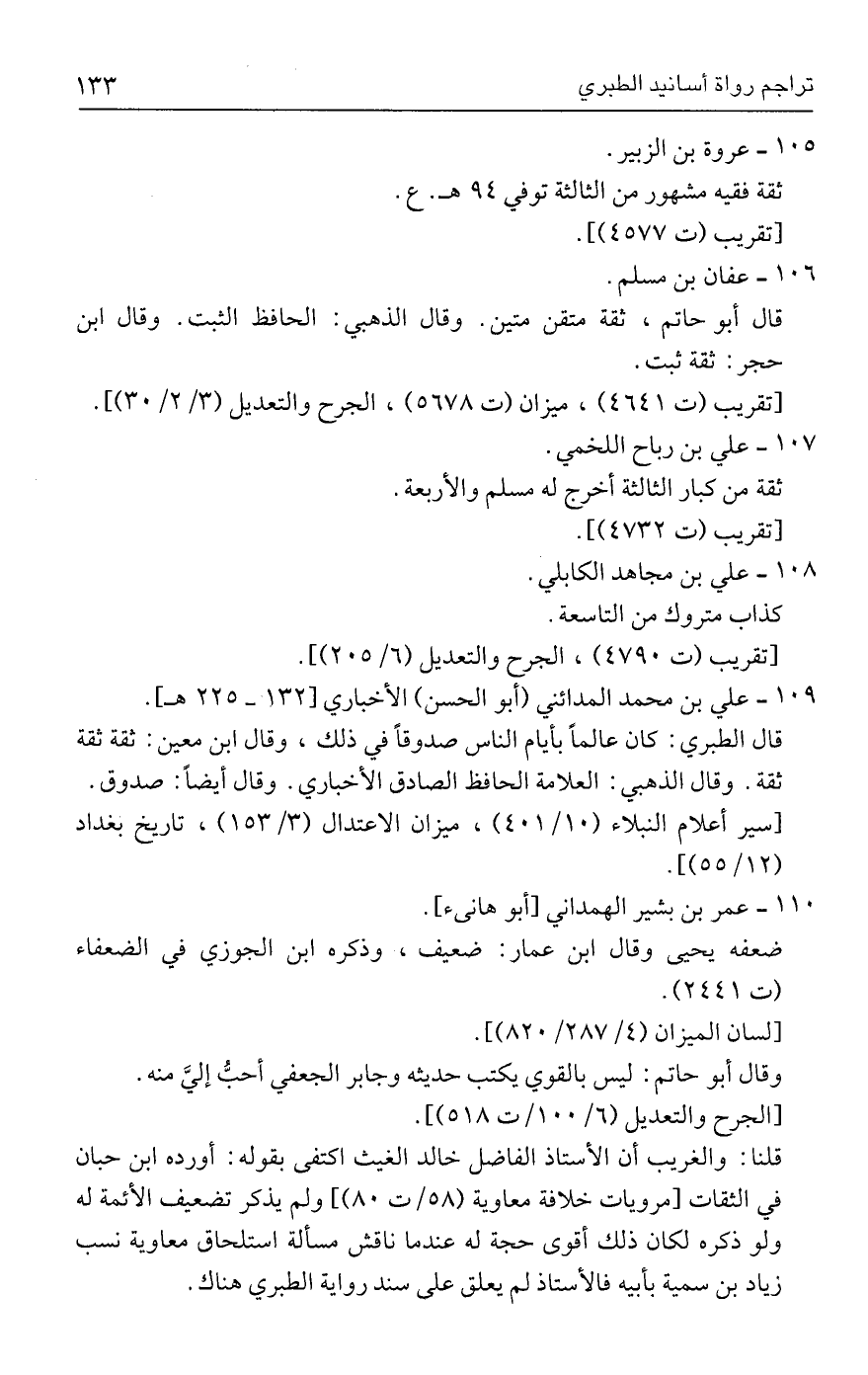 قال الطبري: كان عالمًا بأيام الناس صدوقًا في ذلك، وقال ابن معين: ثقة ثقة ثقة. وقال الذهبي: العلامة الحافظ الصادق الأخباري. وقال أيضًا: صدوق. [سير أعلام النبلاء (١٠/ ٤٠١)، ميزان الاعتدال (٣/ ١٥٣)، تاريخ بغداد (١٢/ ٥٥)].