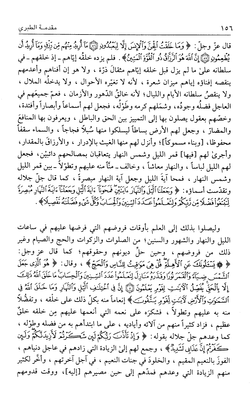 قال عزّ وجلّ: {وَمَا خَلَقْتُ الْجِنَّ وَالْإِنْسَ إلا لِيَعْبُدُونِ (٥٦) مَا أُرِيدُ مِنْهُمْ مِنْ رِزْقٍ وَمَا أُرِيدُ أَنْ يُطْعِمُونِ (٥٧) إِنَّ اللَّهَ هُوَ الرَّزَّاقُ ذُو الْقُوَّةِ الْمَتِينُ (٥٨)}. فلم يزده خلقُه إيّاهم -إذ خلقهم- في سلطانه علي ما لم يزل قبل خلقه إيّاهم مثقال ذرّة، ولا هو إن أفناهم وأعدمهم ينقصه إفناؤه إياهم ميزان شعرة، لأنه لا تغيّره الأحوال، ولا يدخلُه الملال، ولا ينقصُ سلطانه الأيام والليال؛ لأنه خالقُ الدّهور والأزمان، فعمّ جميعَهم في العاجل فضلُه وجودُه، وشمَلهم كرمه وطَوْلُه، فجعل لهم أسماعًا وأبصارًا وأفئدة، وخصّهم بعقول يصلون بها إلي التمييز بين الحق والباطل، ويعرفون بها المنافعَ والمضارّ، وجعل لهم الأرض بساطًا ليسلكوا منها سُبلًا فجاجًا، والسماء سقفًا محفوظا، [وبناء مسموكًا]؛ وأنزل لهم منها الغيث بالإدرار، والأرزاقَ بالمقدار، وأجري لهم [فيها] قمر الليل وشمس النهار يتعاقبان بمصالحهم دائبين، فجعل لهم الليل لباسًا، والنهار معاشًا، وخالف -منًّا منه عليهم وتطوّلًا- بين قمر الليل وشمس النهار، فمحا آيةَ الليل وجعل آية النهار مبصرةً، كما قال جلّ جلاله وتقدّست أسماؤه: {وَجَعَلْنَا اللَّيلَ وَالنَّهَارَ آيَتَينِ فَمَحَوْنَا آيَةَ اللَّيلِ وَجَعَلْنَا آيَةَ النَّهَارِ مُبْصِرَةً لِتَبْتَغُوا فَضْلًا مِنْ رَبِّكُمْ وَلِتَعْلَمُوا عَدَدَ السِّنِينَ وَالْحِسَابَ وَكُلَّ شَيءٍ فَصَّلْنَاهُ تَفْصِيلًا}.