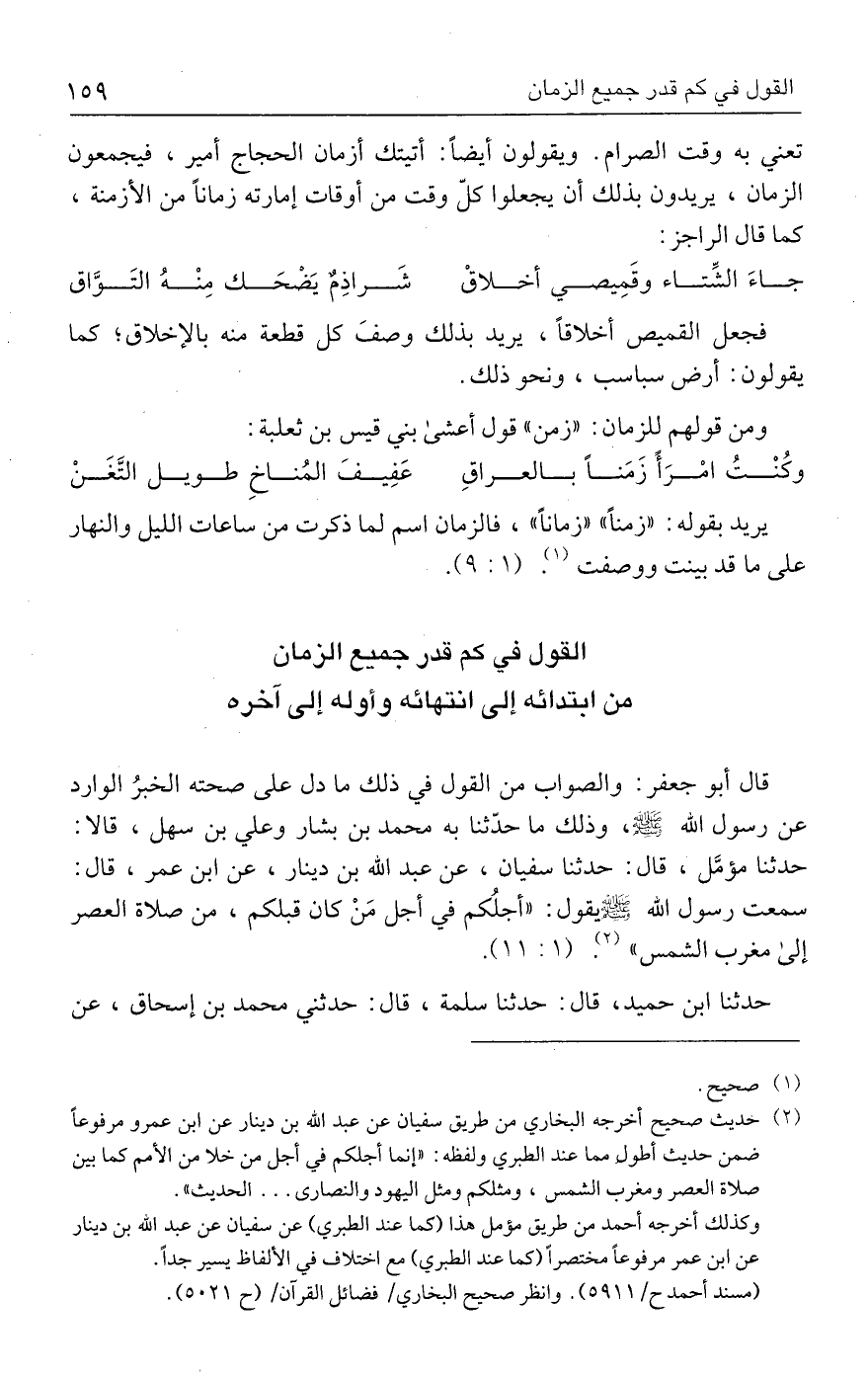 قال أبو جعفر: والصواب من القول في ذلك ما دل علي صحته الخبرُ الوارد عن رسول الله - صلى الله عليه وسلم -، وذلك ما حدَّثنا به محمد بن بشار وعلي بن سهل، قالا: حدثنا مؤمَّل، قال: حدثنا سفيان، عن عبد الله بن دينار، عن ابن عمر، قال: سمعت رسول الله - صلى الله عليه وسلم -: "أجلُكم في أجل مَنْ كان قبلكم، من صلاة العصر إلي مغرب الشمس" (٢). (١: ١١).