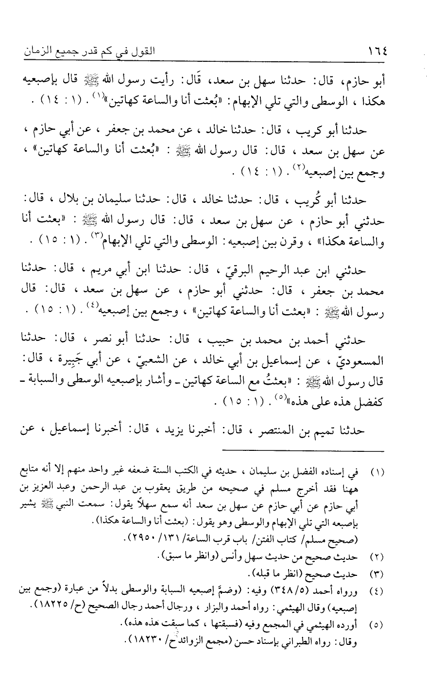 أبو حازم، قال: حدثنا سهل بن سعد، قَال: رأيت رسول الله - صلى الله عليه وسلم - قال بإصبعيه هكذا، الوسطى والتي تلي الإبهام: "بُعثت أنا والساعة كهاتين" (١). (١: ١٤).