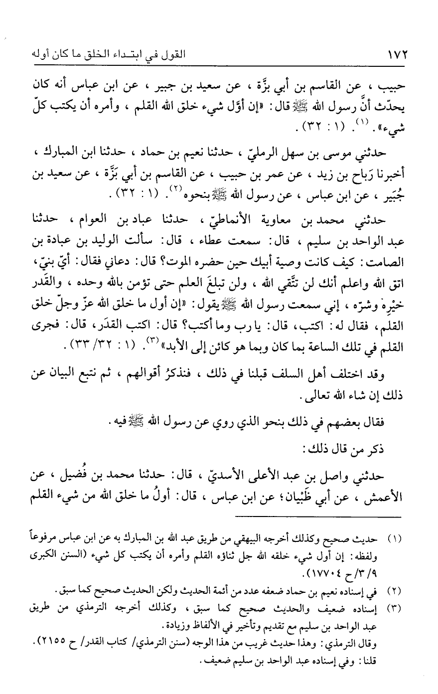 حبيب، عن القاسم بن أبي بزَّة، عن سعيد بن جبير، عن ابن عباس أنه كان يحدّث أن رسول الله - صلى الله عليه وسلم - قال: "إن أوَّل شيء خلق الله القلم، وأمره أن يكتب كلّ شيء". (١). (٣٢: ١)