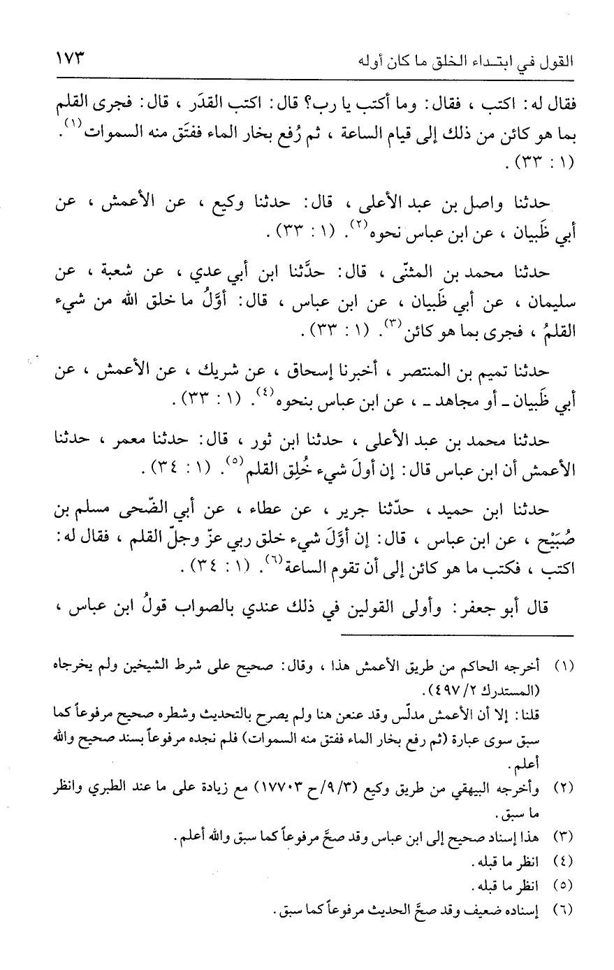حدثنا محمد بن المثنّي، قال: حدَّثنا ابن أبي عدي، عن شعبة، عن سليمان، عن أبي ظَبيان، عن ابن عباس، قال: أوَّلُ ما خلق الله من شيء القلمُ، فجري بما هو كائن (٣). (١: ٣٣).