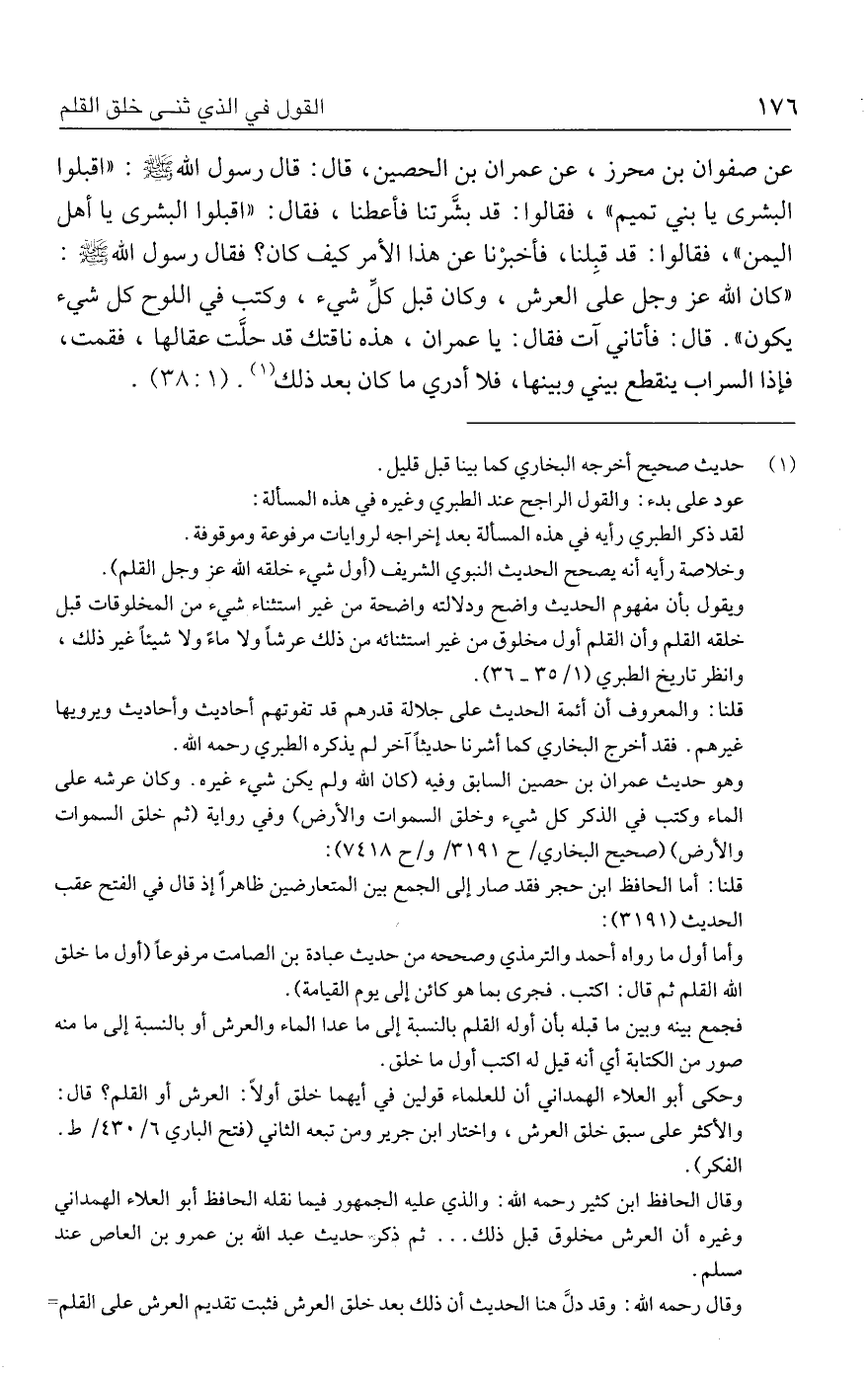 وخلاصة رأيه أنه يصحح الحديث النبوي الشريف (أول شيء خلقه الله عزَّ وجلَّ القلم).