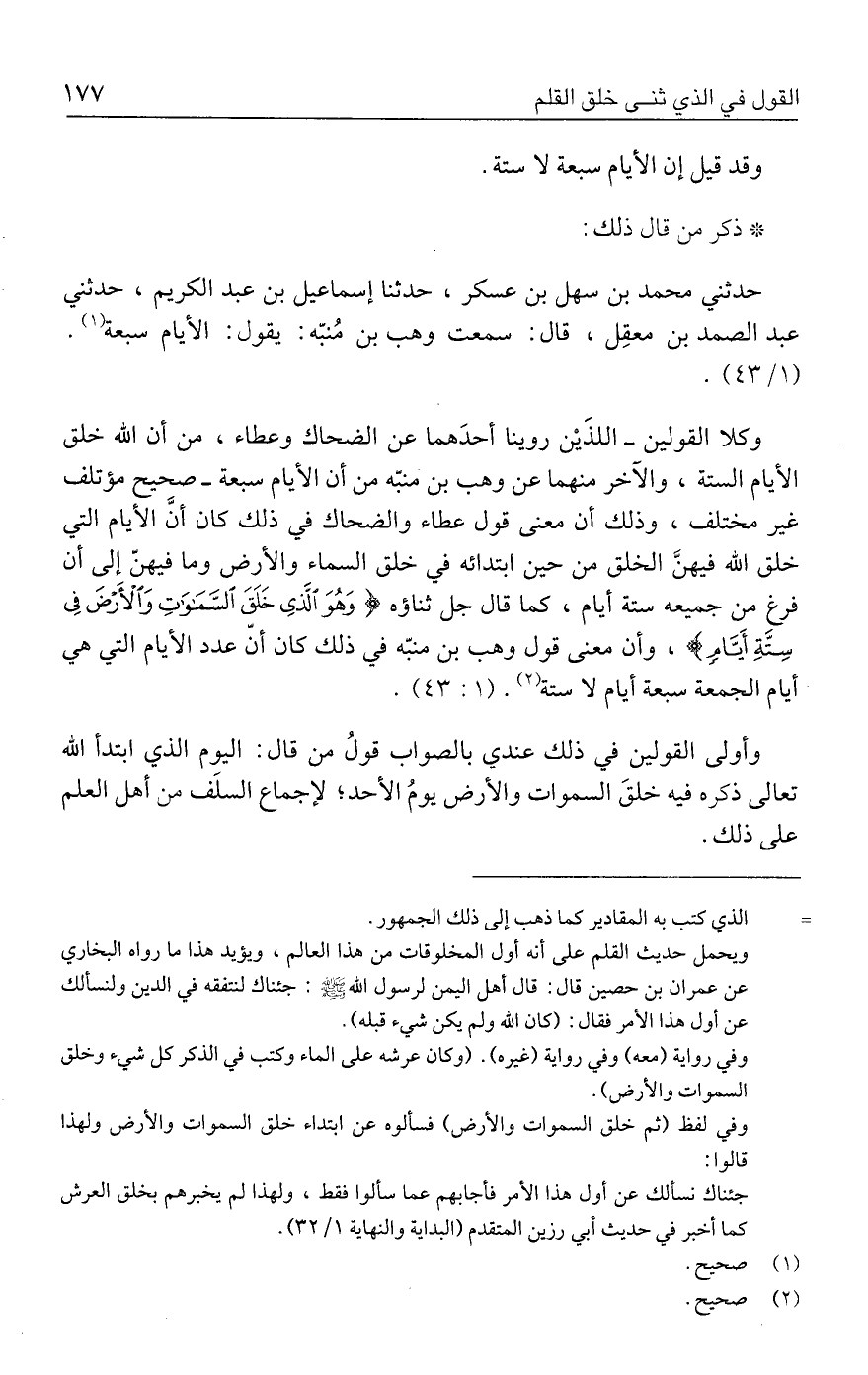 وكلا القولين -اللذَيْن روينا أحدَهما عن الضحاك وعطاء، من أن الله خلق الأيام الستة، والآخر منهما عن وهب بن منبّه من أن الأيام سبعة- صحيح مؤتلف غير مختلف، وذلك أن معنى قول عطاء والضحاك في ذلك كان أن الأيام التي خلق الله فيهنَّ الخلق من حين ابتدائه في خلق السماء والأرض وما فيهنّ إلي أن فرغ من جميعه ستة أيام، كما قال جل ثناؤه {وَهُوَ الَّذِي خَلَقَ السَّمَاوَاتِ وَالْأَرْضَ فِي سِتَّةِ أَيَّامٍ}، وأن معنى قول وهب بن منبّه في ذلك كان أنّ عدد الأيام التي هي أيام الجمعة سبعة أيام لا ستة (٢). (١: ٤٣).