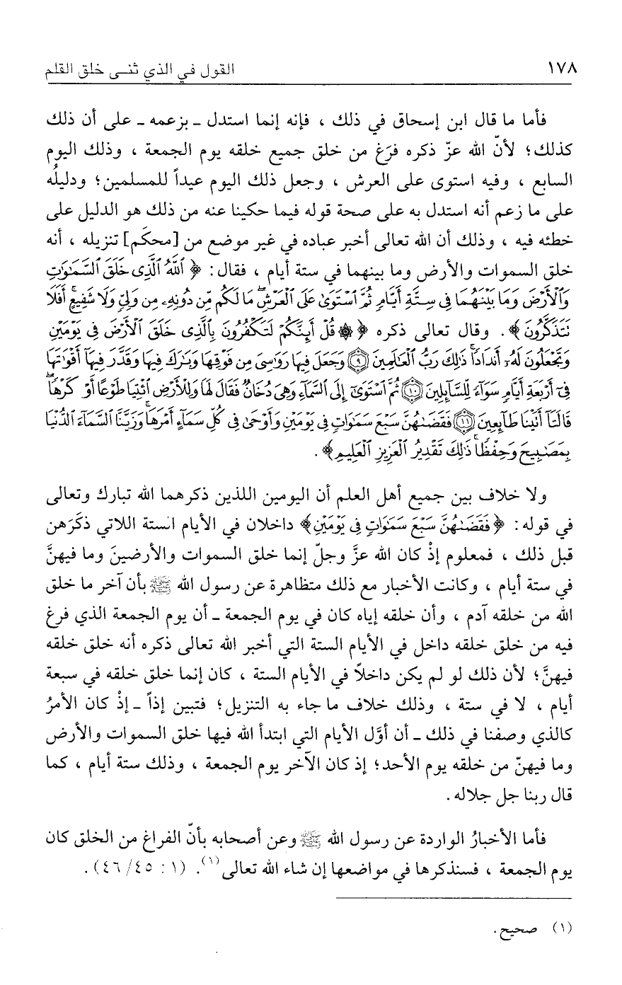 فأما ما قال ابن إسحاق في ذلك، فإنه إنما استدل -بزعمه- على أن ذلك كذلك؛ لأنّ الله عزّ ذكره فرَغ من خلق جميع خلقه يوم الجمعة، وذلك اليوم السابع، وفيه استوي علي العرش، وجعل ذلك اليوم عيدًا للمسلمين؛ ودليلُه علي ما زعم أنه استدل به علي صحة قوله فيما حكينا عنه من ذلك هو الدليل علي خطئه فيه، وذلك أن الله تعالى أخبر عباده في غير موضع من [محكَم] تنزيله، أنه خلق السموات والأرض وما بينهما في ستة أيام، فقال: {اللَّهُ الَّذِي خَلَقَ السَّمَاوَاتِ وَالْأَرْضَ وَمَا بَينَهُمَا فِي سِتَّةِ أَيَّامٍ ثُمَّ اسْتَوَى عَلَى الْعَرْشِ مَا لَكُمْ مِنْ دُونِهِ مِنْ وَلِيٍّ وَلَا شَفِيعٍ أَفَلَا تَتَذَكَّرُونَ}. وقال تعالى ذكره {قُلْ أَئِنَّكُمْ لَتَكْفُرُونَ بِالَّذِي خَلَقَ الْأَرْضَ فِي يَوْمَينِ وَتَجْعَلُونَ لَهُ أَنْدَادًا ذَلِكَ رَبُّ الْعَالمِينَ (٩) وَجَعَلَ فِيهَا رَوَاسِيَ مِنْ فَوْقِهَا وَبَارَكَ فِيهَا وَقَدَّرَ فِيهَا أَقْوَاتَهَا فِي أَرْبَعَةِ أَيَّامٍ سَوَاءً لِلسَّائِلِينَ (١٠) ثُمَّ اسْتَوَى إِلَى السَّمَاءِ وَهِيَ دُخَانٌ فَقَال لَهَا وَلِلْأَرْضِ ائْتِيَا طَوْعًا أَوْ كَرْهًا قَالتَا أَتَينَا طَائِعِينَ (١١) فَقَضَاهُنَّ سَبْعَ سَمَاوَاتٍ فِي يَوْمَينِ وَأَوْحَى فِي كُلِّ سَمَاءٍ أَمْرَهَا وَزَيَّنَّا السَّمَاءَ الدُّنْيَا بِمَصَابِيحَ وَحِفْظًا ذَلِكَ تَقْدِيرُ الْعَزِيزِ الْعَلِيمِ (١٢)}.