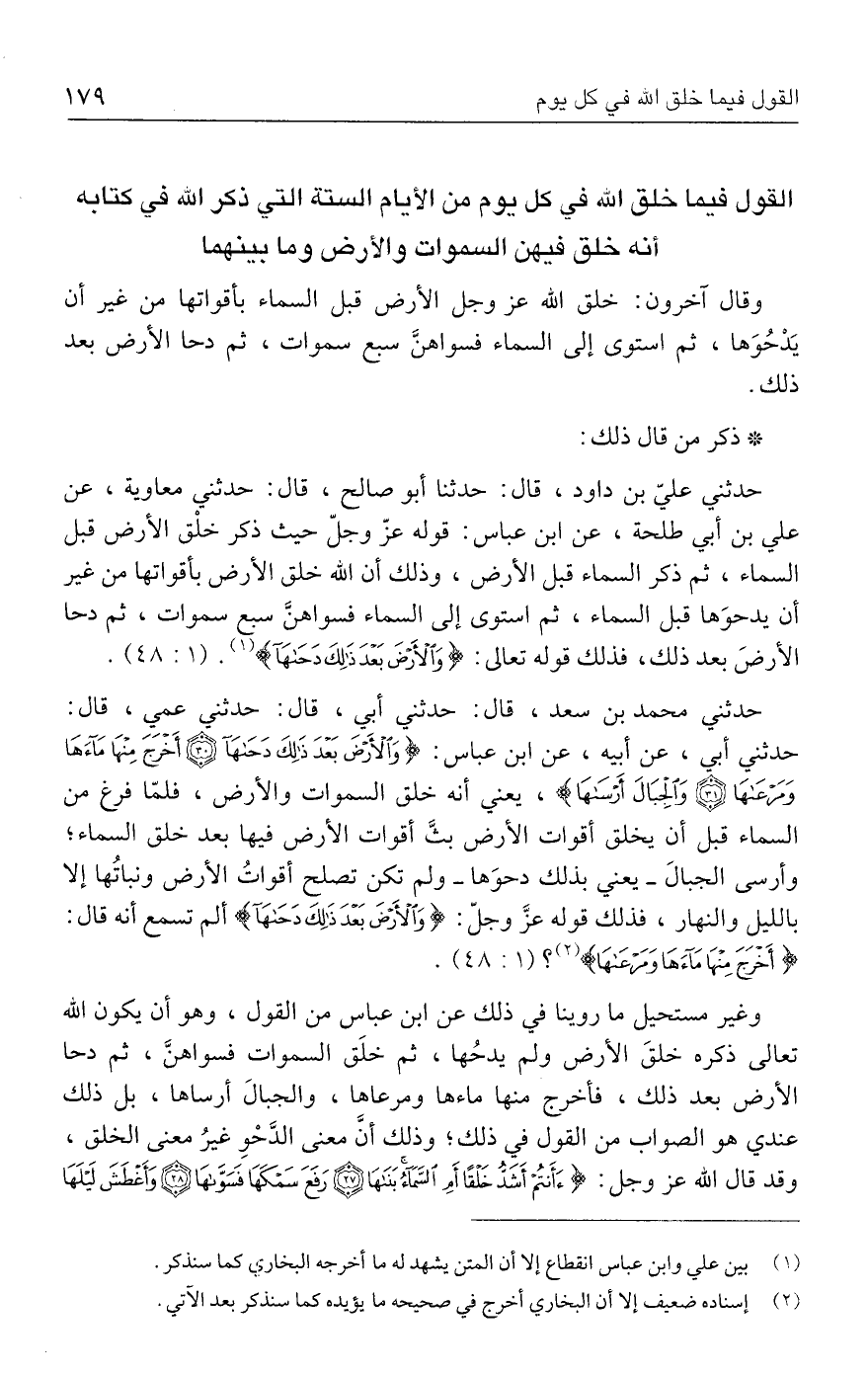 حدثني محمد بن سعد، قال: حدثني أبي، قال: حدثني عمي، قال: حدثني أبي، عن أبيه، عن ابن عباس: {وَالْأَرْضَ بَعْدَ ذَلِكَ دَحَاهَا (٣٠) أَخْرَجَ مِنْهَا مَاءَهَا وَمَرْعَاهَا (٣١) وَالْجِبَال أَرْسَاهَا (٣٢)}، يعني أنه خلق السموات والأرض، فلمّا فرغ من السماء قبل أن يخلق أقوات الأرض بثَّ أقوات الأرض فيها بعد خلق السماء؛ وأرسى الجبال -يعني بذلك دحوَها- ولم تكن تصلح أقواتُ الأرض ونباتُها إلا بالليل والنهار، فذلك قوله عزَّ وجلّ: {وَالْأَرْضَ بَعْدَ ذَلِكَ دَحَاهَا} ألم تسمع أنه قال: {أَخْرَجَ مِنْهَا مَاءَهَا وَمَرْعَاهَا} (٢)؟ (٤٨: ١).