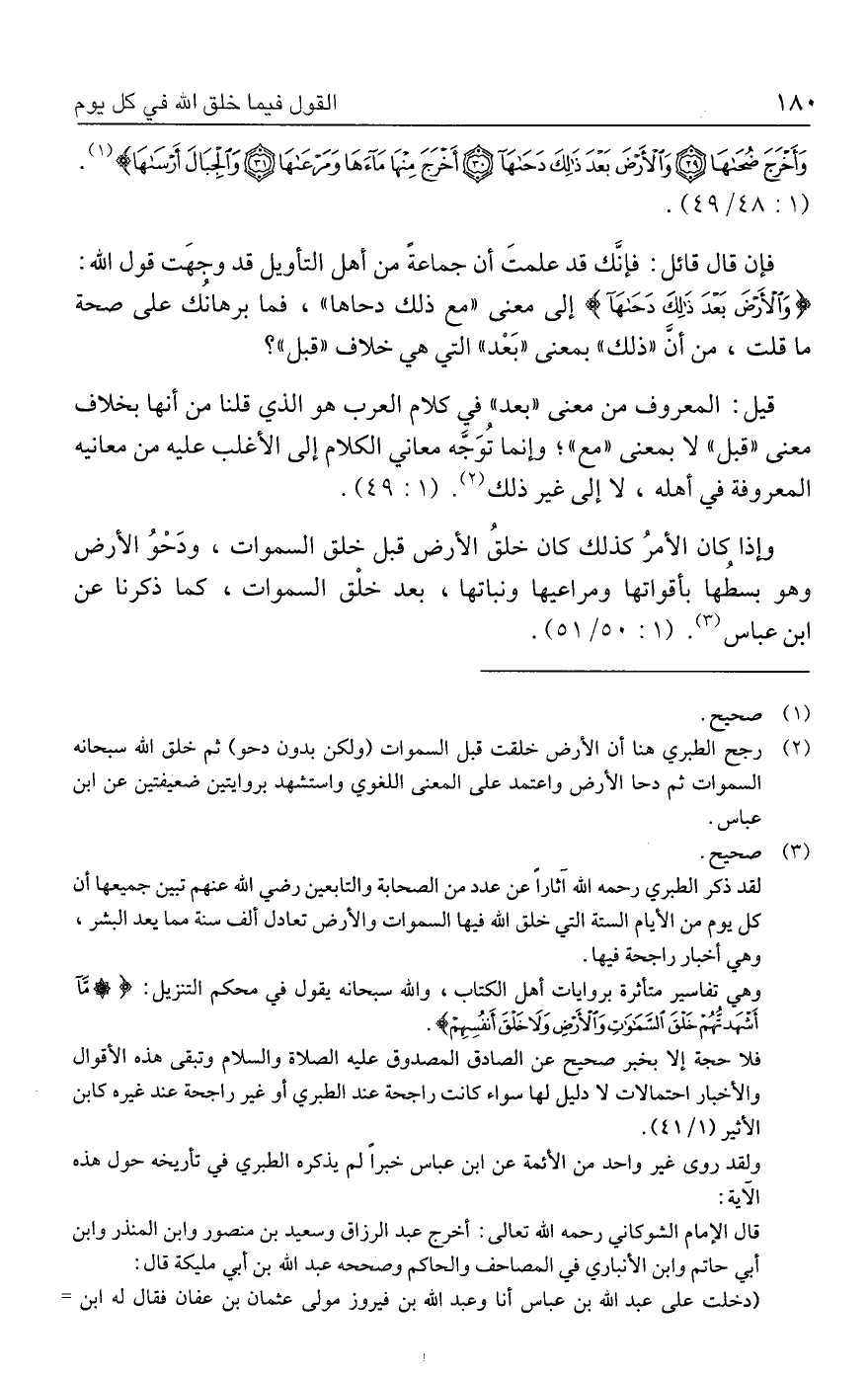 (٢) رجح الطبري هنا أن الأرض خلقت قبل السموات (ولكن بدون دحو) ثم خلق الله سبحانه السموات ثم دحا الأرض واعتمد على المعنى اللغوي واستشهد بروايتين ضعيفتين عن ابن عباس.
