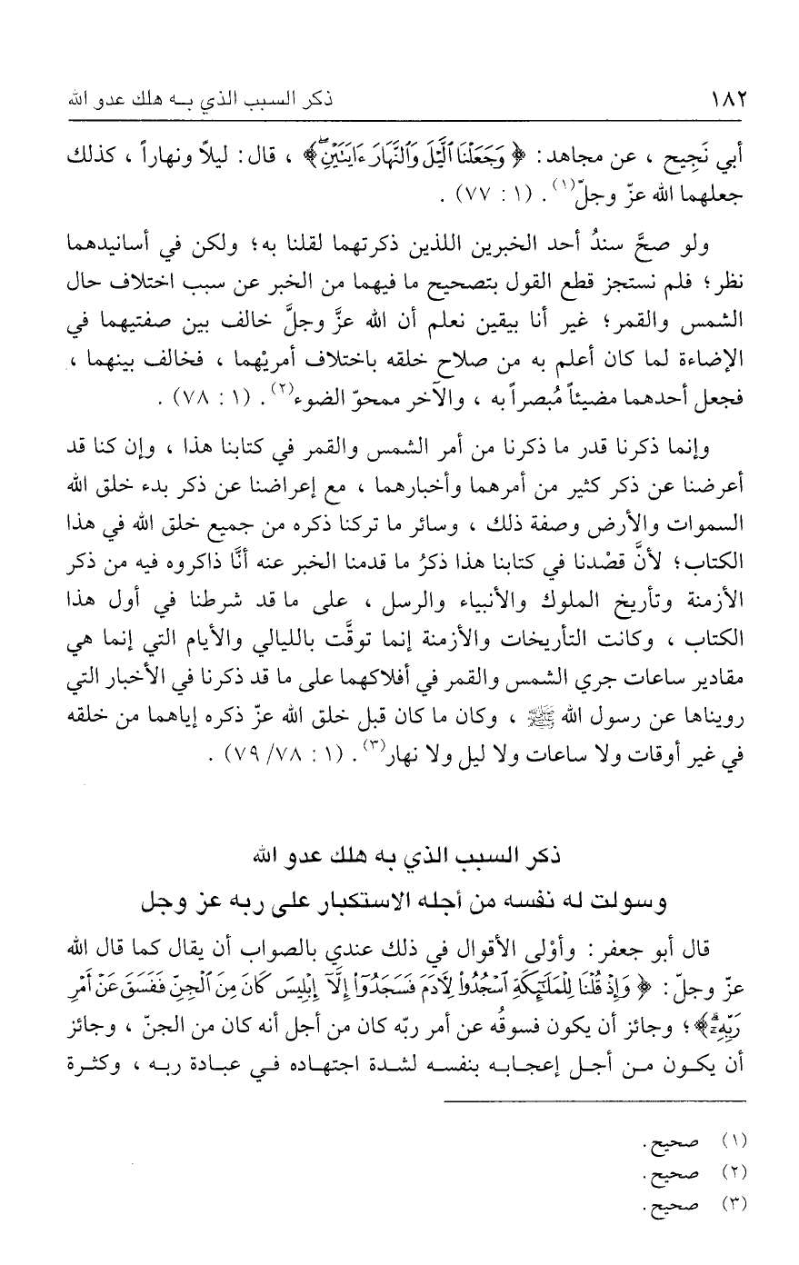 وإنما ذكرنا قدر ما ذكرنا من أمر الشمس والقمر في كتابنا هذا، وإن كنا قد أعرضنا عن ذكر كثير من أمرهما وأخبارهما، مع إعراضنا عن ذكر بدء خلق الله السموات والأرض وصفة ذلك، وسائر ما تركنا ذكره من جميع خلق الله في هذا الكتاب؛ لأنَّ قصْدنا في كتابنا هذا ذكرُ ما قدمنا الخبر عنه أنَّا ذاكروه فيه من ذكر الأزمنة وتأريخ الملوك والأنبياء والرسل، على ما قد شرطنا في أول هذا الكتاب، وكانت التأريخات والأزمنة إنما توقَّت بالليالي والأيام التي إنما هي مقادير ساعات جري الشمس والقمر في أفلاكهما علي ما قد ذكرنا في الأخبار التي رويناها عن رسول الله - صلى الله عليه وسلم -، وكان ما كان قبل خلق الله عزّ ذكره إياهما من خلقه في غير أوقات ولا ساعات ولا ليل ولا نهار (٣). (١: ٧٨/ ٧٩).