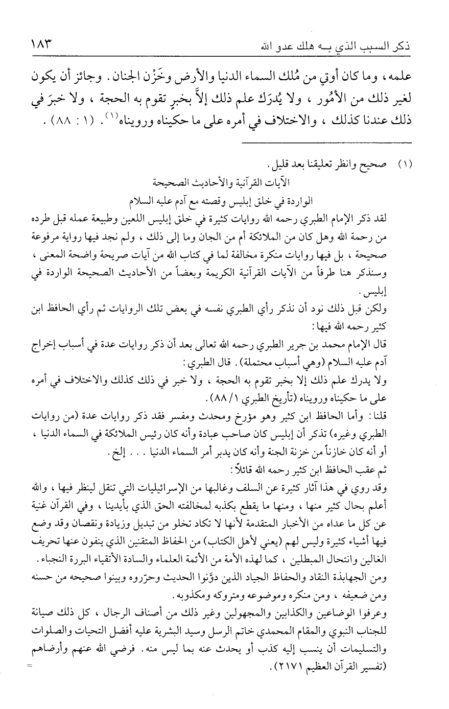 قلنا: وأما الحافظ ابن كثير وهو مؤرخ ومحدث ومفسر فقد ذكر روايات عدة (من روايات الطبري وغيره) تذكر أن إبليس كان صاحب عبادة وأنه كان رئيس الملائكة في السماء الدنيا، أو أنه كان خازنًا من خزنة الجنة وأنه كان يدبر أمر السماء الدنيا ... إلخ.