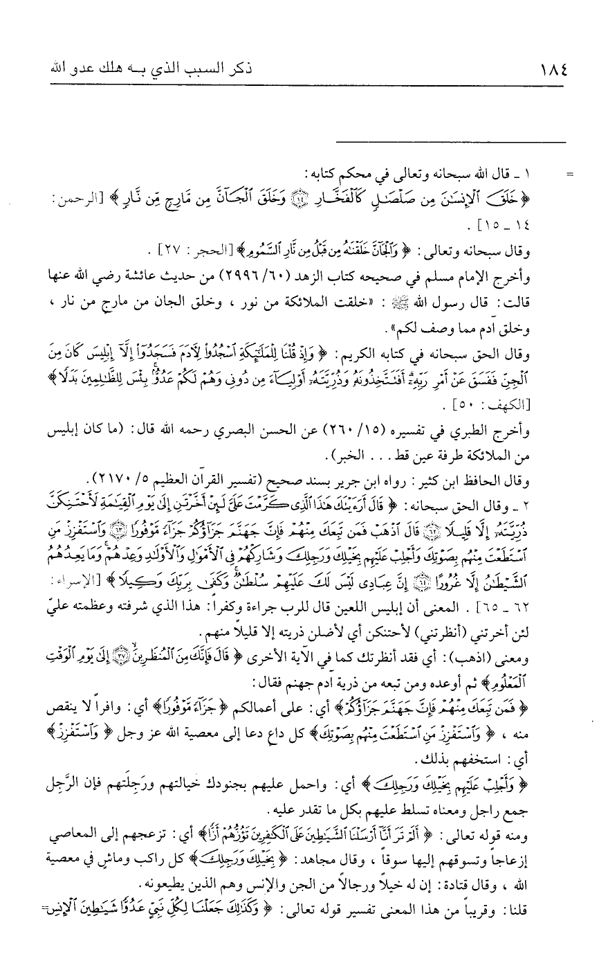 ٢ - وقال الحق سبحانه: {قَال أَرَأَيتَكَ هَذَا الَّذِي كَرَّمْتَ عَلَيَّ لَئِنْ أَخَّرْتَنِ إِلَى يَوْمِ الْقِيَامَةِ لَأَحْتَنِكَنَّ ذُرِّيَّتَهُ إلا قَلِيلًا (٦٢) قَال اذْهَبْ فَمَنْ تَبِعَكَ مِنْهُمْ فَإِنَّ جَهَنَّمَ جَزَاؤُكُمْ جَزَاءً مَوْفُورًا (٦٣) وَاسْتَفْزِزْ مَنِ اسْتَطَعْتَ مِنْهُمْ بِصَوْتِكَ وَأَجْلِبْ عَلَيهِمْ بِخَيلِكَ وَرَجِلِكَ وَشَارِكْهُمْ فِي الْأَمْوَالِ وَالْأَوْلَادِ وَعِدْهُمْ وَمَا يَعِدُهُمُ الشَّيطَانُ إلا غُرُورًا (٦٤) إِنَّ عِبَادِي لَيسَ لَكَ عَلَيهِمْ سُلْطَانٌ وَكَفَى بِرَبِّكَ وَكِيلًا (٦٥)} [الإسراء: ٦٢ - ٦٥]. المعنى أن إبليس اللعين قال للرب جراءة وكفرًا: هذا الذي شرفته وعظمته عليّ لئن أخرتني (أنظرتني) لأحتنكن أي لأضلن ذريته إلا قليلًا منهم.