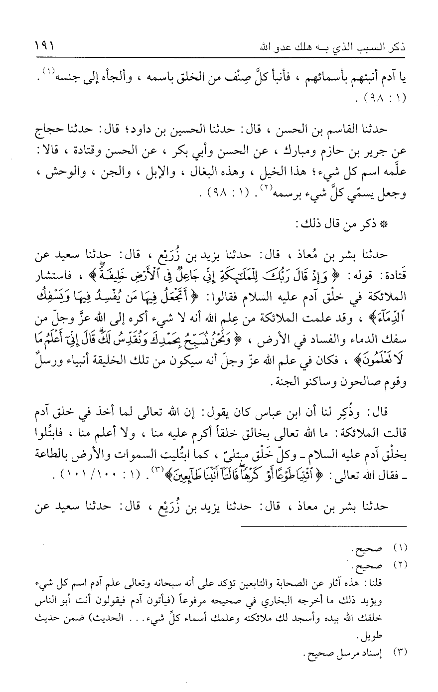 حدثنا القاسم بن الحسن، قال: حدثنا الحسين بن داود؛ قال: حدثنا حجاج عن جرير بن حازم ومبارك، عن الحسن وأبي بكر، عن الحسن وقتادة، قالا: علَّمه اسم كل شيء؛ هذا الخيل، وهذه البغال، والإبل، والجن، والوحش، وجعل يسمّي كلَّ شيء برسمه (٢). (١: ٩٨).