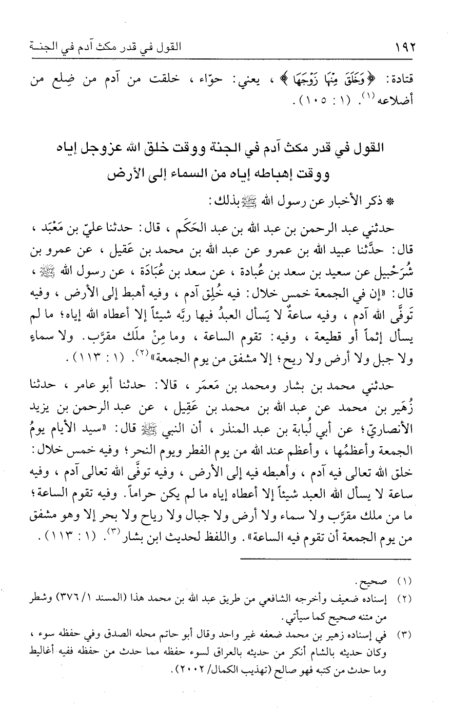 حدثني عبد الرحمن بن عبد الله بن عبد الحَكَم، قال: حدثنا عليّ بن مَعْبَد، قال: حدَّثنا عبيد الله بن عمرو عن عبد الله بن محمد بن عَقيل، عن عمرو بن شُرَحْبيل عن سعيد بن سعد بن عُبادة، عن سعد بن عُبَادَة، عن رسول الله - صلى الله عليه وسلم -، قال: "إن في الجمعة خمس خلال: فيه خُلِق آدم، وفيه أهبط إلى الأرض، وفيه تَوفَّى الله آدم، وفيه ساعةٌ لا يَسأل العبدُ فيها ربَّه شيئًا إلا أعطاه الله إياه؛ ما لم يسأل إثمًا أو قطيعة، وفيه: تقوم الساعة، وما مِنْ ملَك مقرَّب. ولا سماءٍ ولا جبل ولا أرض ولا ريح؛ إلا مشفق من يوم الجمعة" (٢). (١: ١١٣).