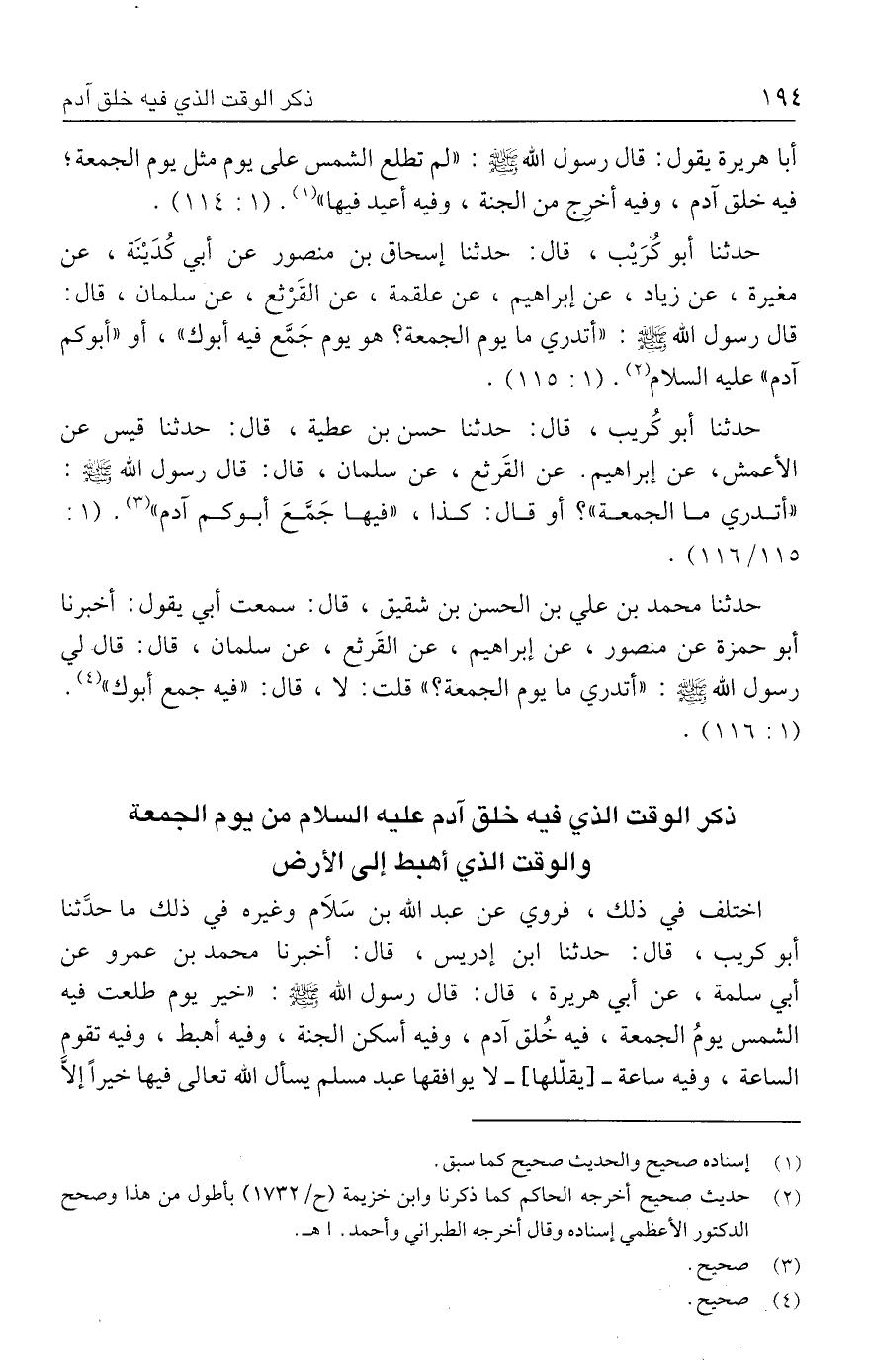 أبا هريرة يقول: قال رسول الله - صلى الله عليه وسلم -: "لم تطلع الشمس علي يوم مثل يوم الجمعة؛ فيه خلق آدم، وفيه أخرِج من الجنة، وفيه أعيد فيها" (١). (١: ١١٤).