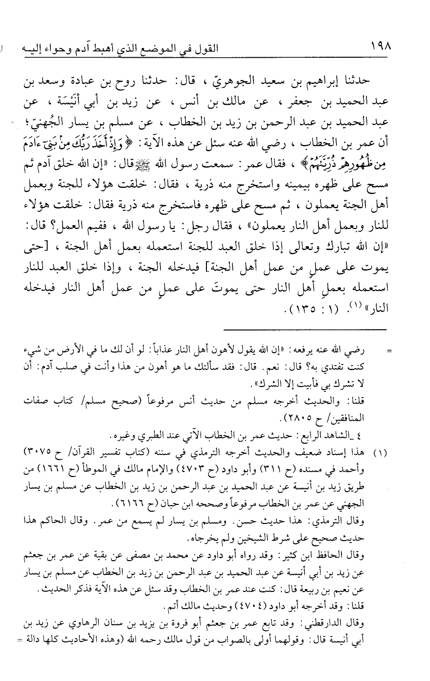 حدثنا إبراهيم بن سعيد الجوهريّ، قال: حدثنا روح بن عبادة وسعد بن عبد الحميد بن جعفر، عن مالك بن أنس، عن زيد بن أبي أنَيسَة، عن عبد الحميد بن عبد الرحمن بن زيد بن الخطاب، عن مسلم بن يسار الجُهنيّ؛ أن عمر بن الخطاب، رضي الله عنه سئل عن هذه الآية: {وَإِذْ أَخَذَ رَبُّكَ مِنْ بَنِي آدَمَ مِنْ ظُهُورِهِمْ ذُرِّيَّتَهُمْ}، فقال عمر: سمعت رسول الله - صلى الله عليه وسلم - قال: "إن الله خلق آدم ثم مسح على ظهره بيمينه واستخرج منه ذرية، فقال: خلقت هؤلاء للجنة وبعمل أهل الجنة يعملون، ثم مسح على ظهره فاستخرج منه ذرية فقال: خلقت هؤلاء للنار وبعمل أهل النار يعملون"، فقال رجل: يا رسول الله، ففيم العمل؟ قال: "إن الله تبارك وتعالى إذا خلق العبد للجنة استعمله بعمل أهل الجنة، [حتى يموت على عملٍ من عمل أهل الجنة] فيدخله الجنة، وإذا خلق العبد للنار استعمله بعملِ أهل النار حتى يموتَ على عملٍ من عمل أهل النار فيدخله النار" (١). (١: ١٣٥).