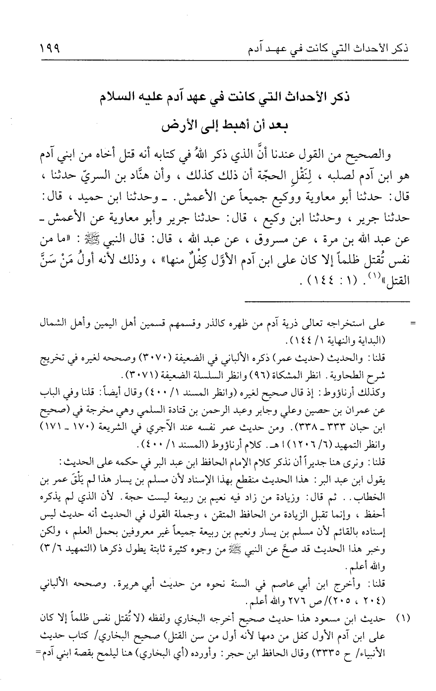 (١) حديث ابن مسعود هذا حديث صحيح أخرجه البخاري ولفظه (لا تُقتل نفس ظلمًا إلا كان على ابن آدم الأول كفل من دمها لأنه أول من سن القتل) صحيح البخاري / كتاب حديث الأنبياء / ح ٣٣٣٥) وقال الحافظ ابن حجر: وأورده (أي البخاري) هنا ليلمح بقصة ابني آدم =